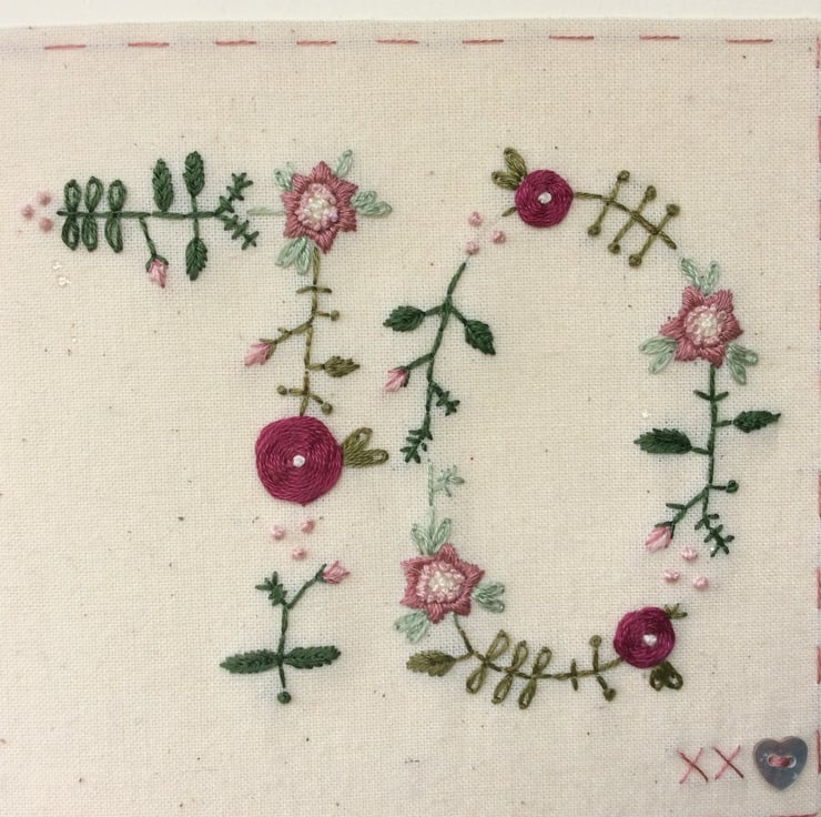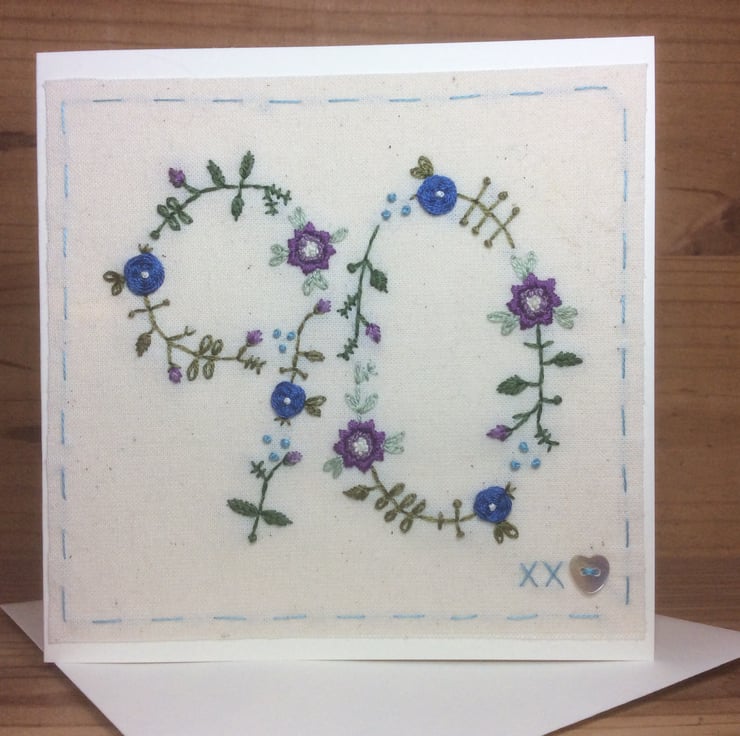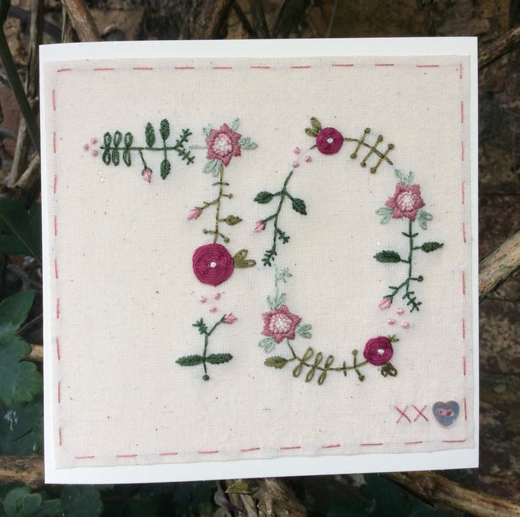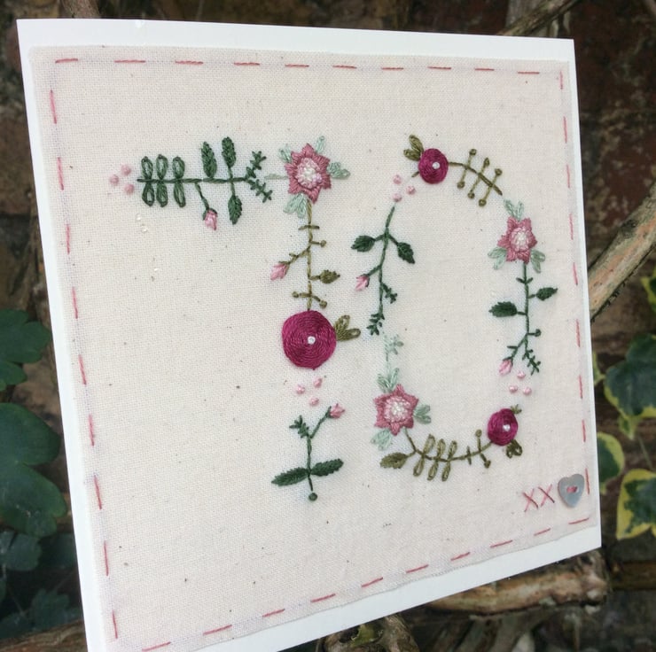 A beautifully made keepsake hand embroidered card. This card is stitched with leaves and flowers in the shape of the number required and colours can be changed to suit. It is stitched onto calico and backed onto cream card with matching envelope. It is left blank inside for your own wording. This design is also available as a 18th, 21st, 30th, 40th, 50th, 60th 70th, 80th, 90th and can be made in different colours. All of my cards are carefully wrapped in cellophane and tissue paper and sent out within one day of purchase unless a custom order.