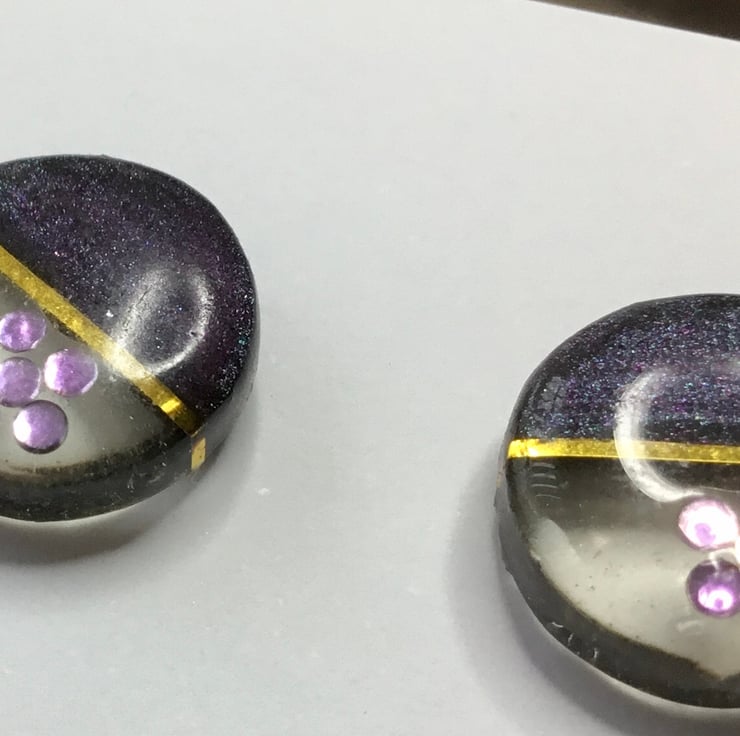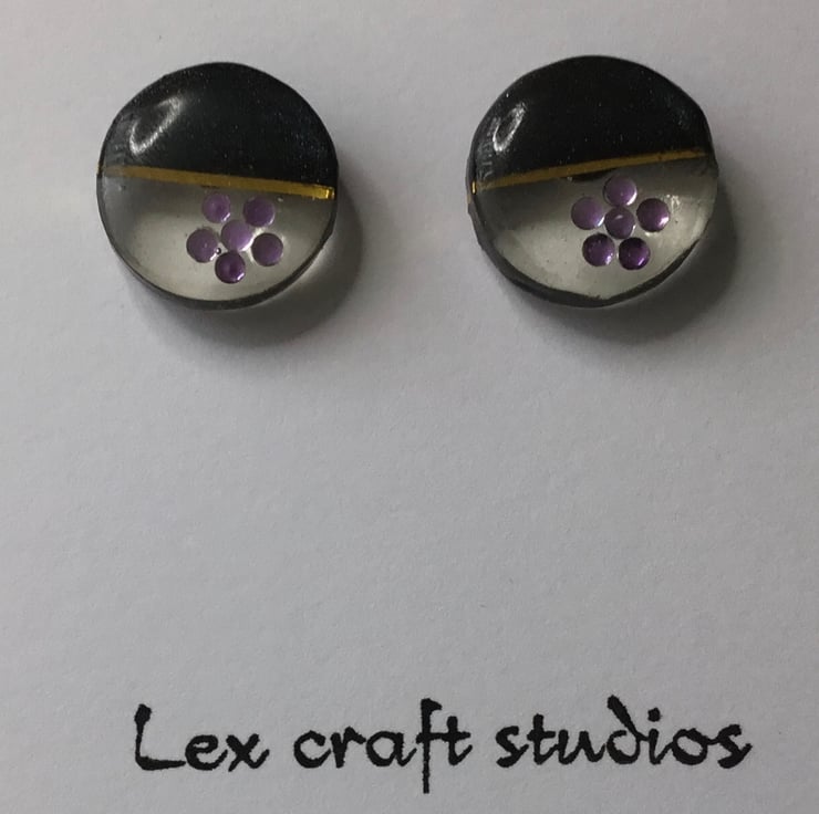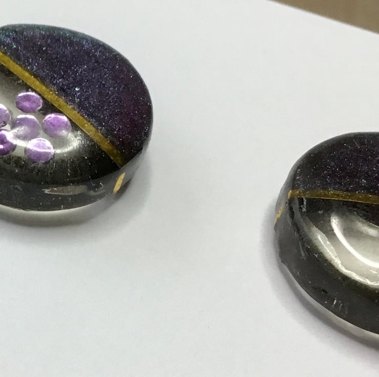 A delightful pair of handmade resin earrings . In Green purple shimmer that changes in the light , with purple crystals.