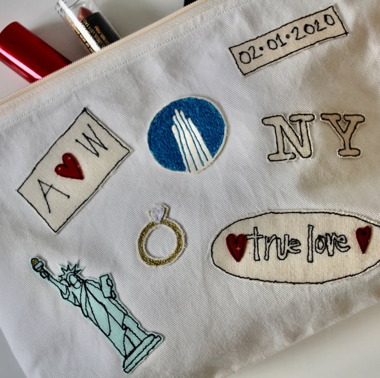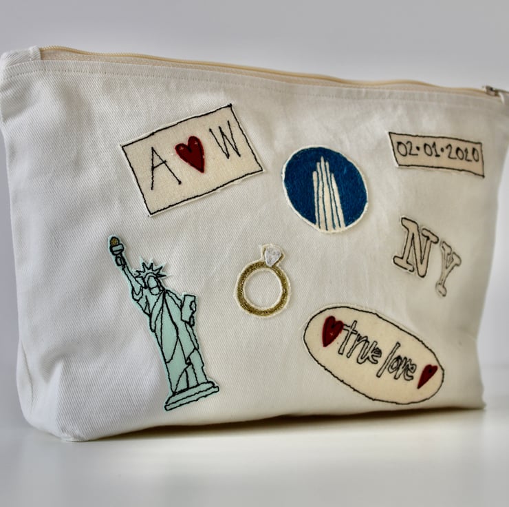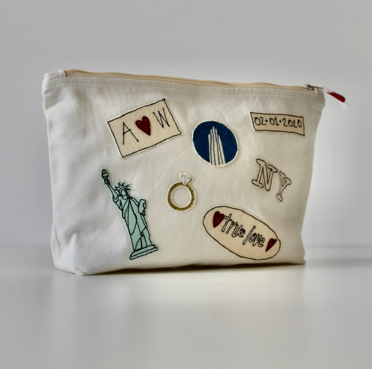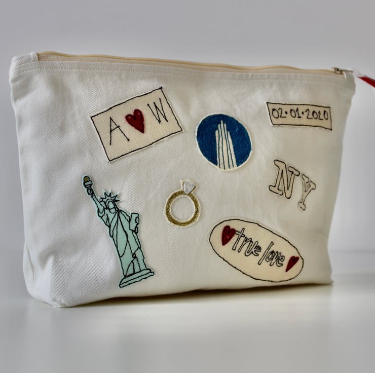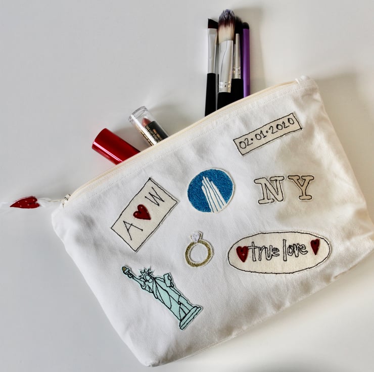 Each of the images on this handmade pouch are sewn using cotton cloth and free hand machine embroidery; multiple layers of cloth are sewn together and cut out by hand using very sharp scissors.