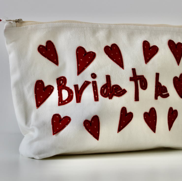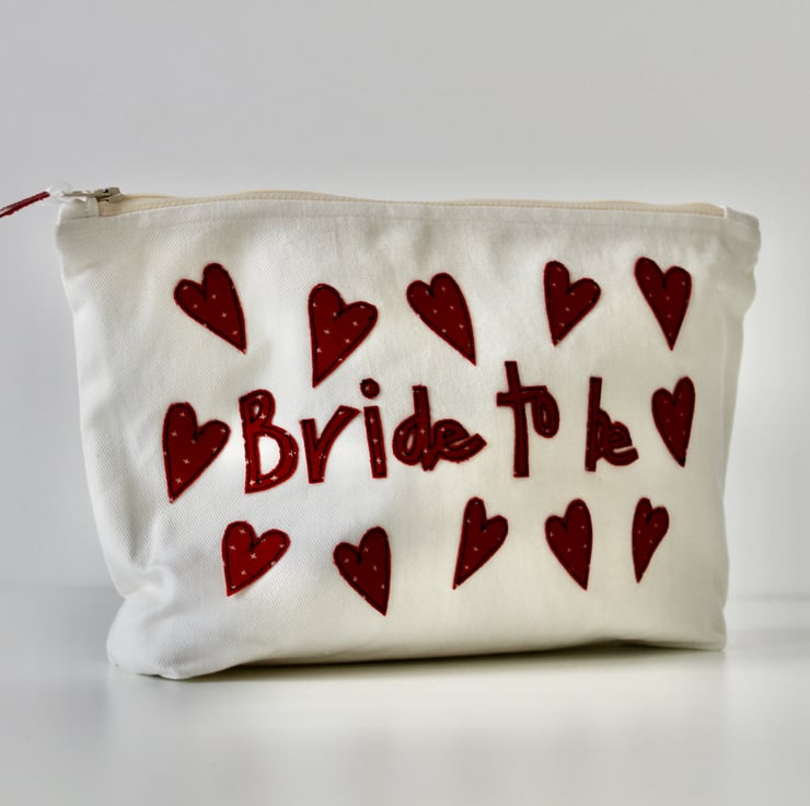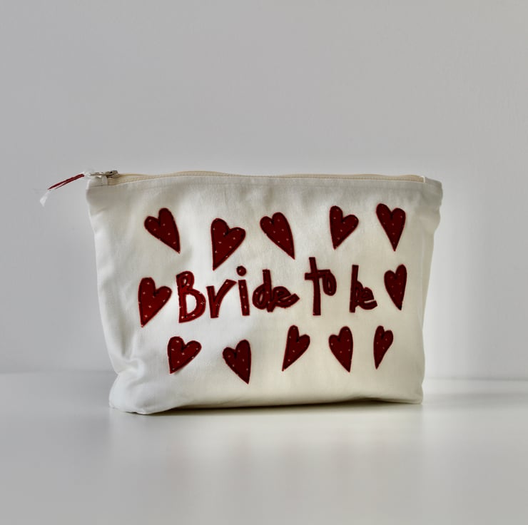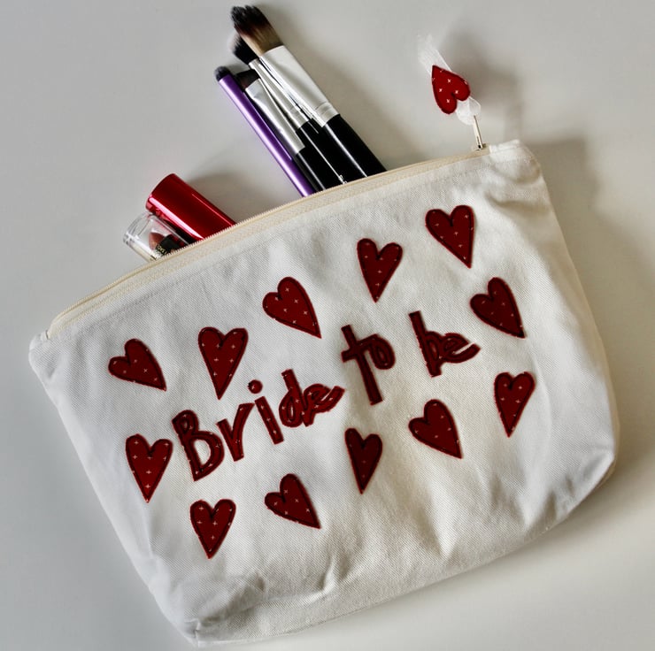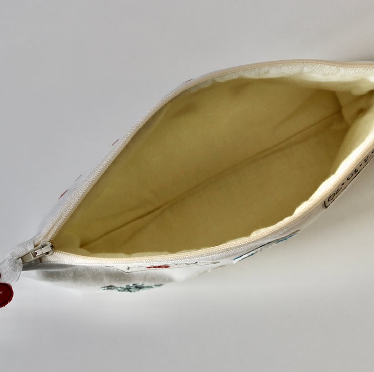The pouch itself is handmade using soft cotton twill and is lined with a cream cotton cloth. There is a heart and organza ribbon attached to the zip allowing easy opening and closing.