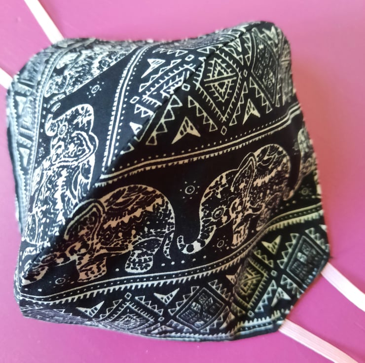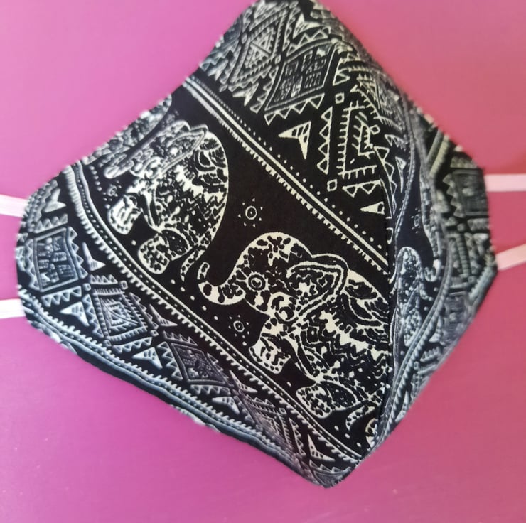 Beautiful black and white design Elephant fabric for this fun and funky facemask! Stylish and practical, washable and reusable and so much better for the environment than disposable facemasks. Why not save the planet and look good? Handmade, fully lined and with a pocket for a filter if required (not included) with elastic loops for a comfortable fit. This is not medical grade PPE.