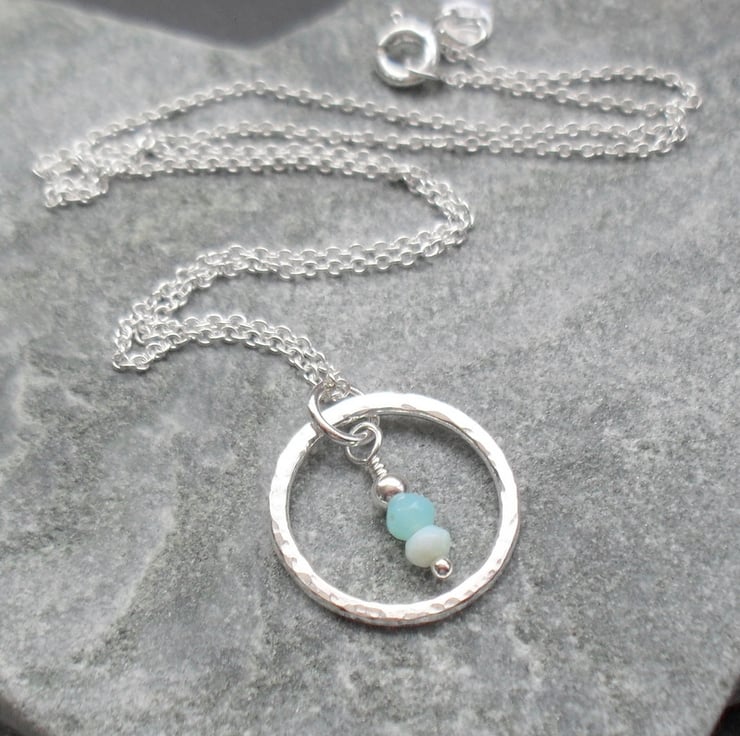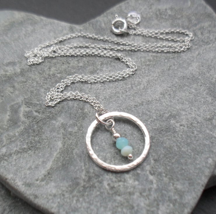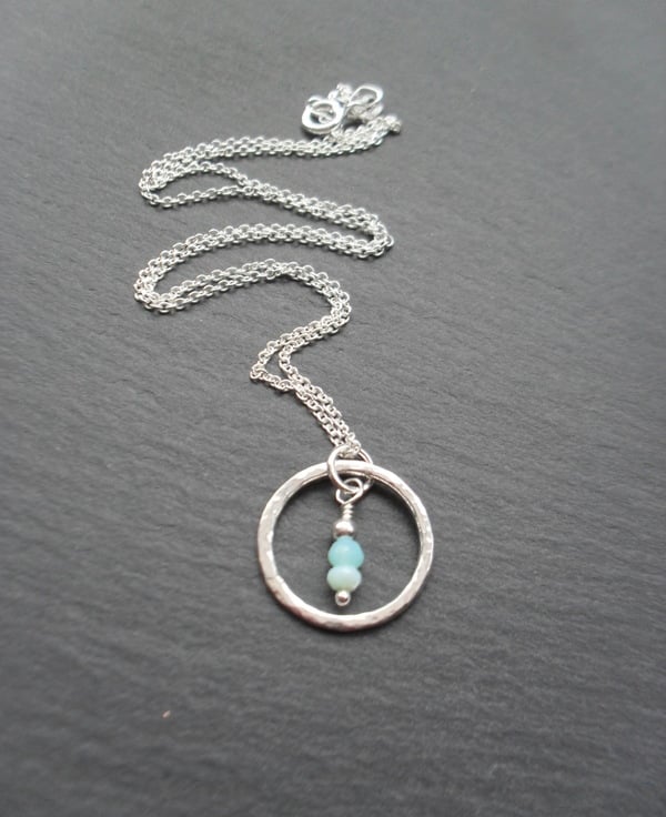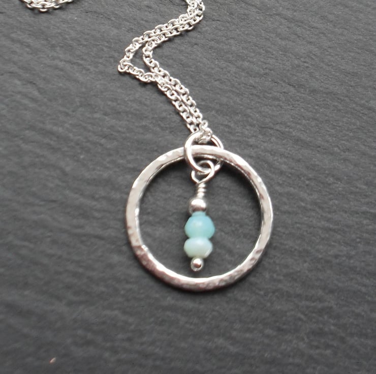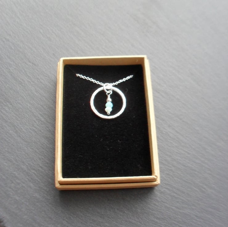 This pendant has been made with sterling silver wire which has been formed into a circle and soldered together. The Circle has blue opal semi precious gemstone suspended from the centre