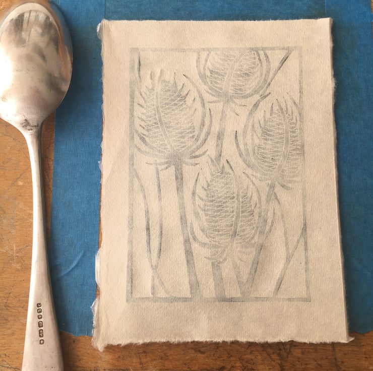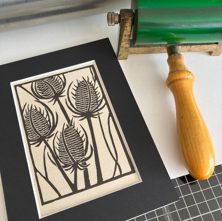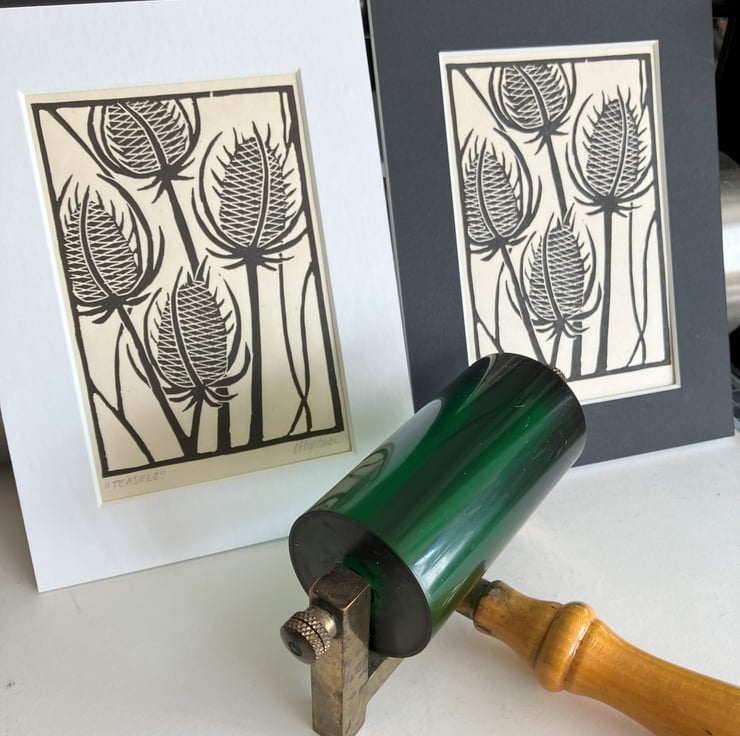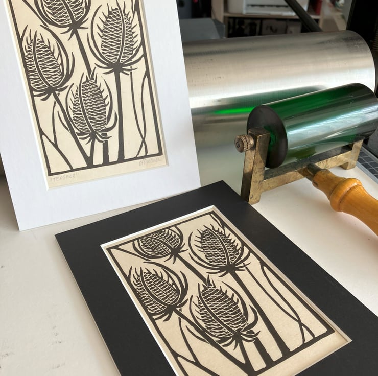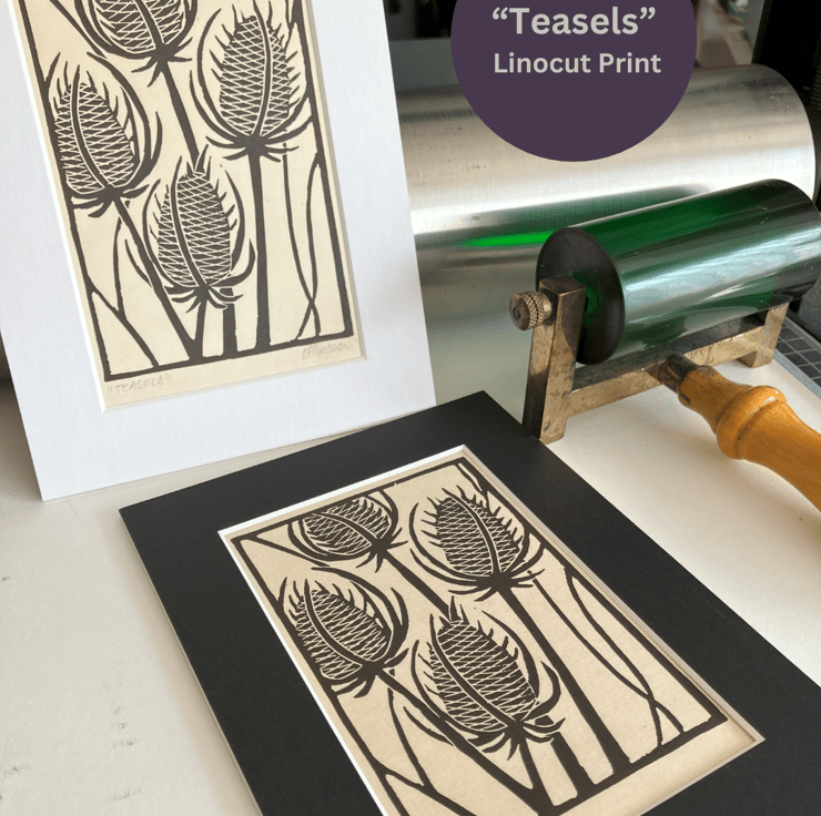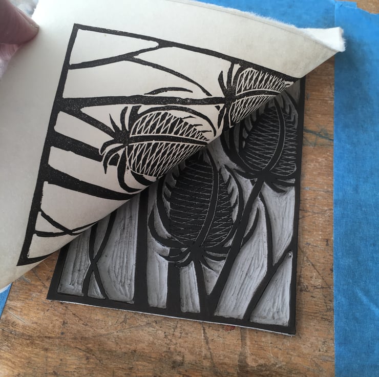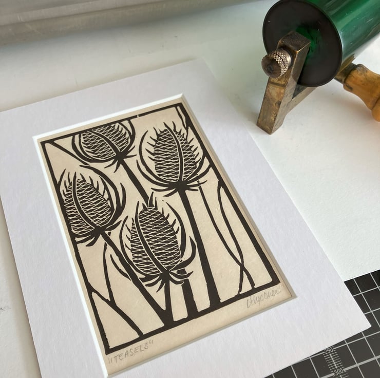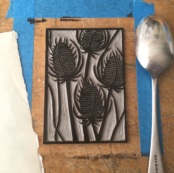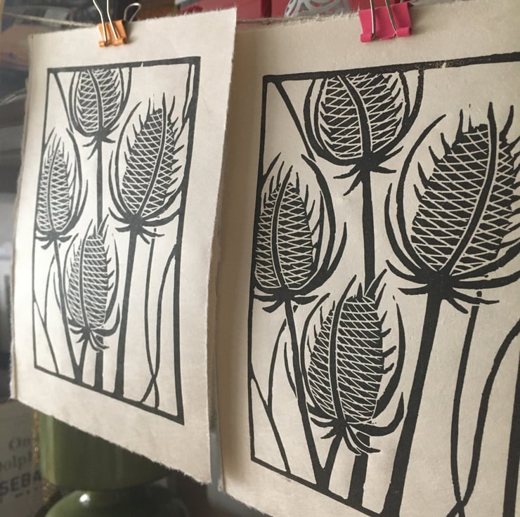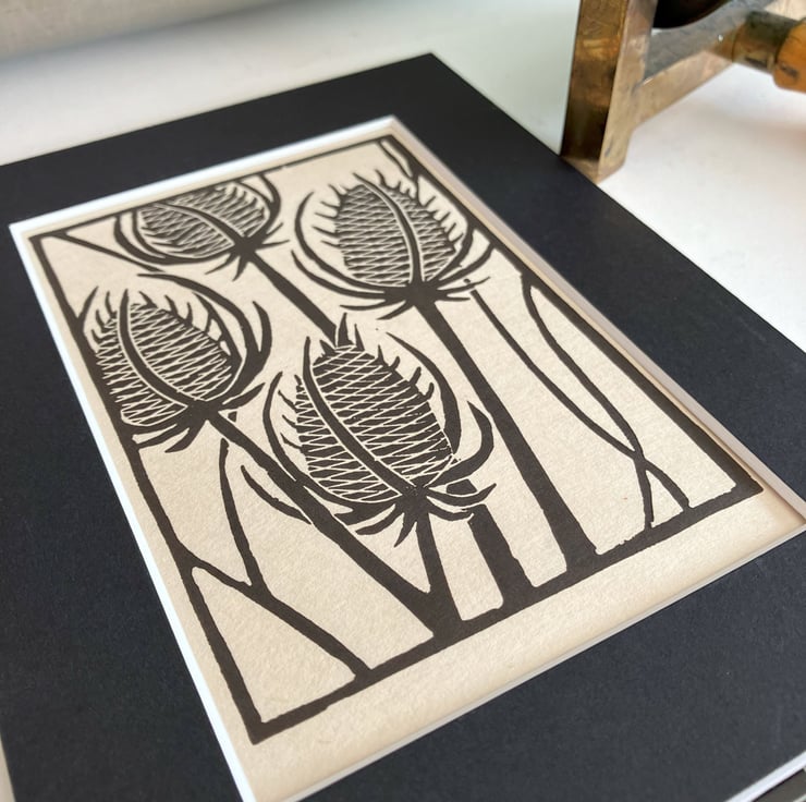 "Teasels" is created using the relief printmaking method of linocut printing. As each print is created by hand there may be tiny variations which add to the individual beauty of each original artwork. "Teasels" is printed onto Kitakata 36gsm printmaking paper from the Awagami factory in Japan.