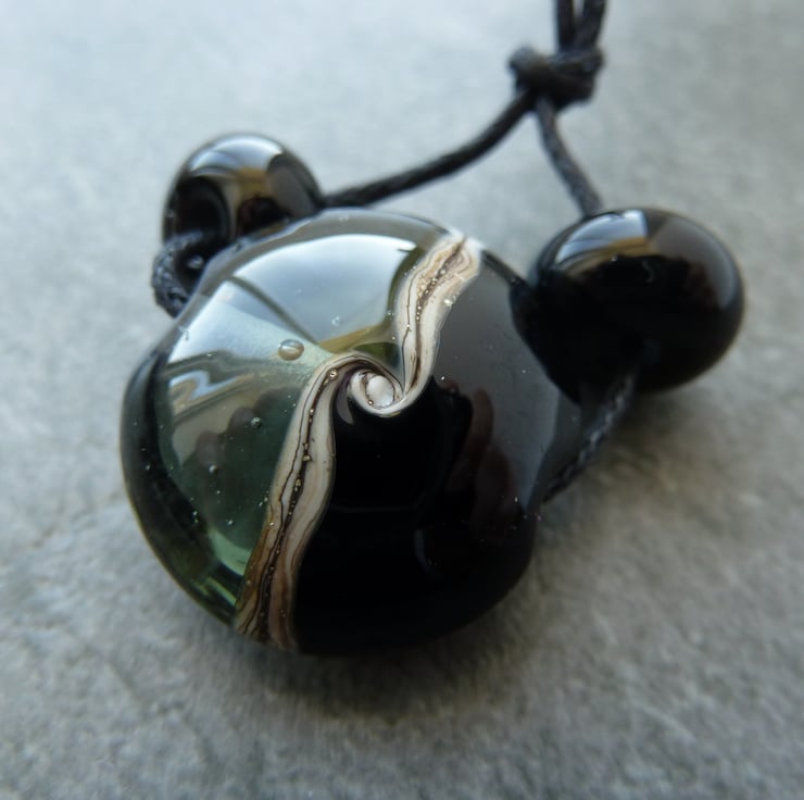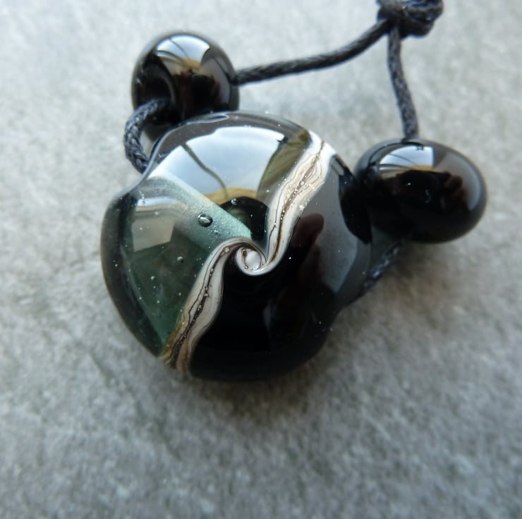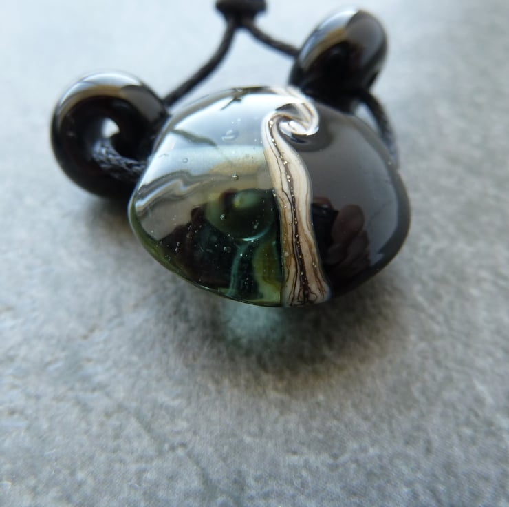 A lampwork glass focal bead made with grey and black glass, it features a silvered ivory swirl and has been shaped using a brass press.
