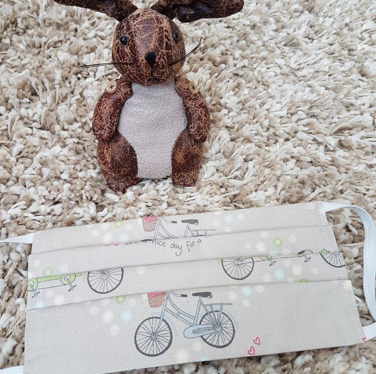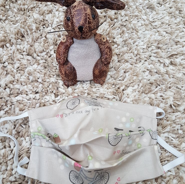Adult face covering/mask made from a bicycle and tandem print on beige cotton. The face mask is made with 2 layers of cotton forming an inner pocket for a filter (not included) and is fastened over the ears with 2 loops of elastic and a toggle adjuster.
