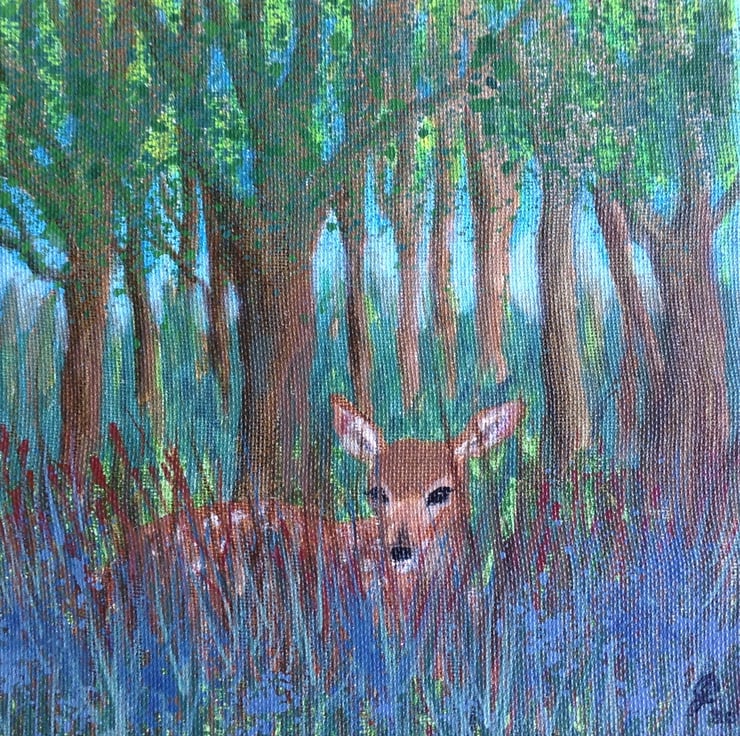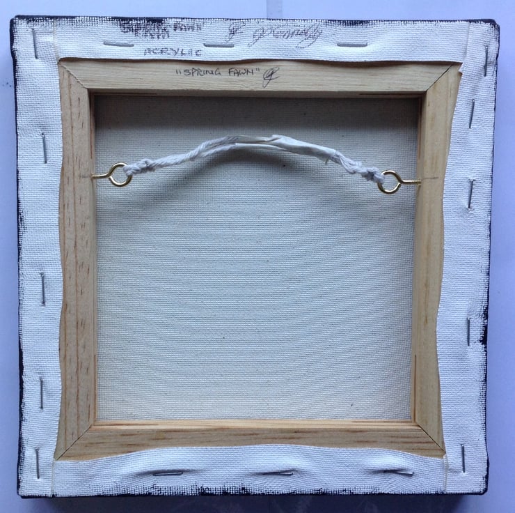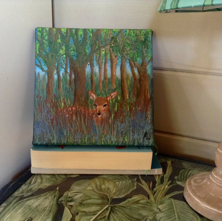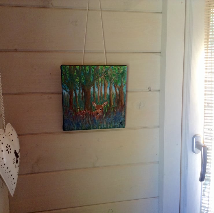The painting measures 8" x 8" (20 x 20 cm) and has a fawn hiding amongst the woodland spring flowers. This small canvas comes with fittings ready to hang on your wall, or it can be easily displayed on shelves or tables.