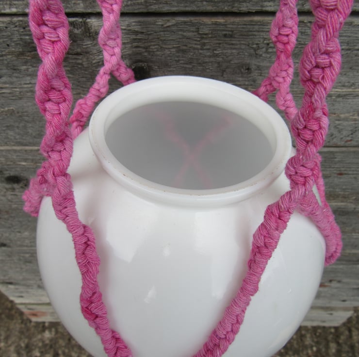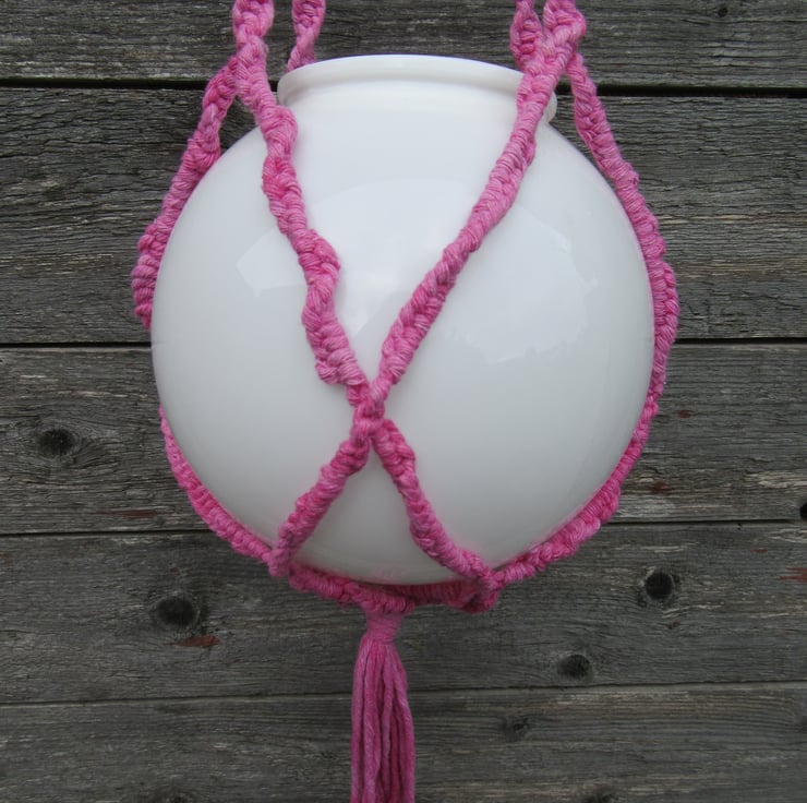 The string is dyed a dusky pink, to contrast against the spherical white molded glass lamp shade, which makes a great container for a plant. It can be hung using the metal ring.