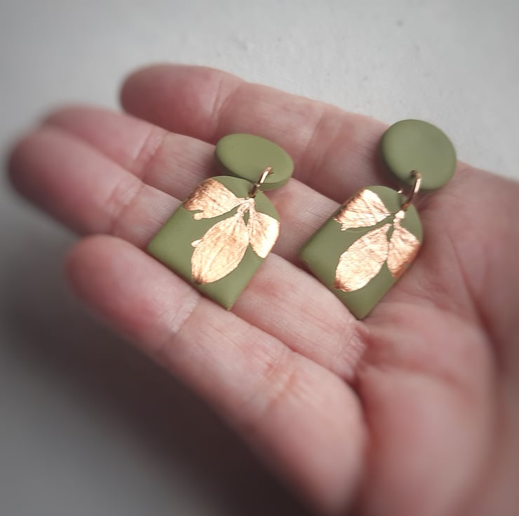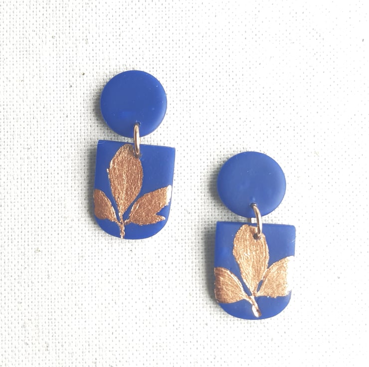 These earrings are sweet little dangles made from deep blue polymer clay which has been imprinted with a real leaf and then gilded with metallic copper leaf. They would make a charming gift for a loved one or to yourself. They are part of my 'Botanical metallics' collection and there are other versions available in my shop - please take a look.