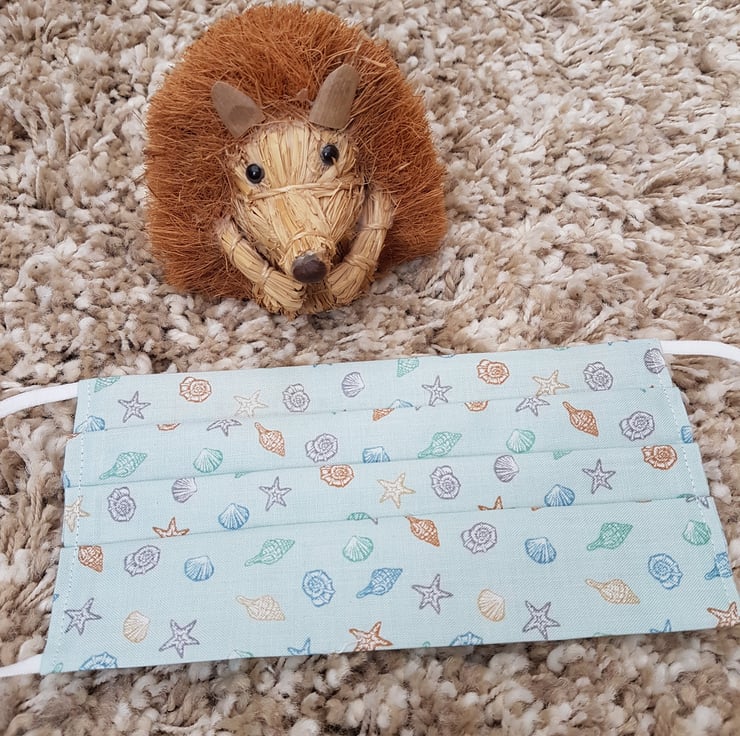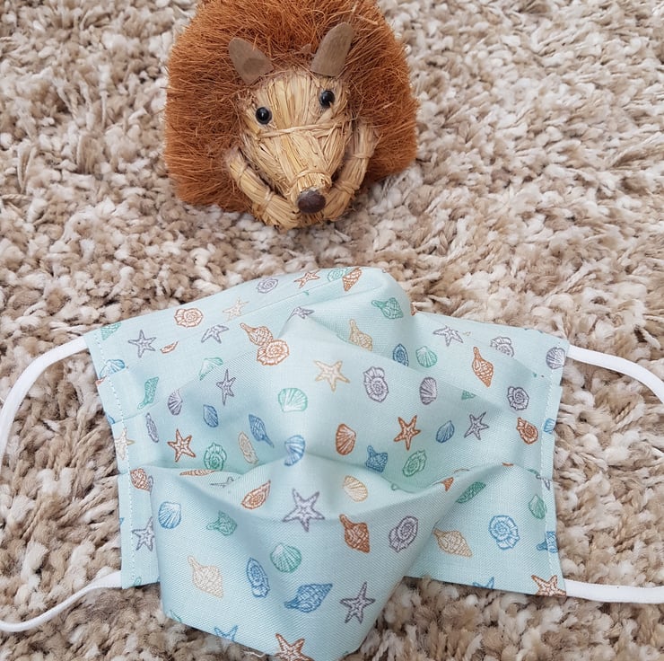 Small Adult/Teenager face covering made from a sea shell print on aqua cotton. The face mask is made with 2 layers of cotton forming an inner pocket for a filter (not included) and is fastened over the ears with 2 loops of elastic and a toggle adjuster.