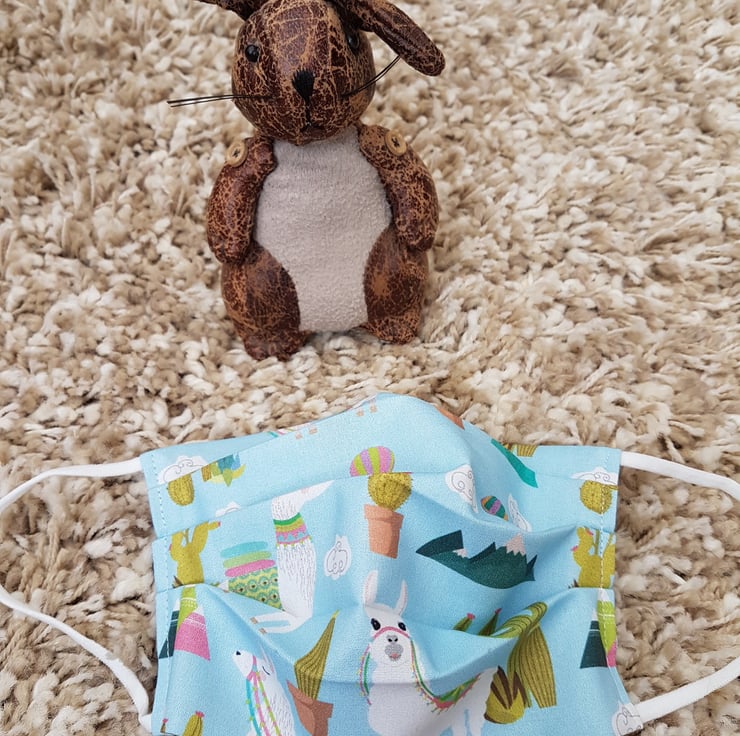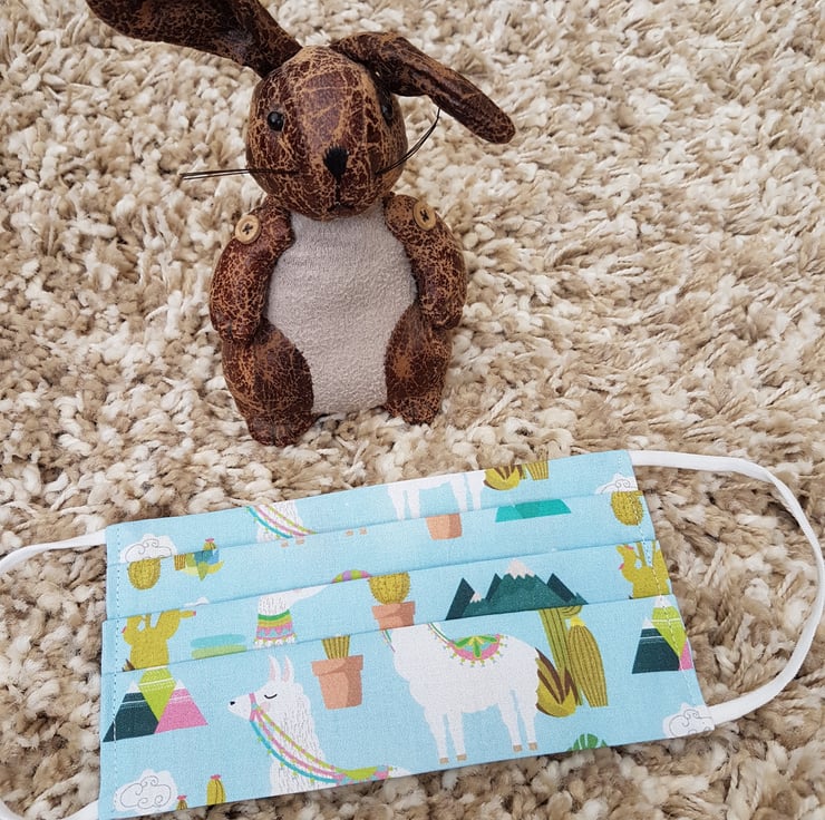 Adult face covering/mask made from a llama print on pale blue cotton. The face mask is made with 2 layers of cotton forming an inner pocket for a filter (not included) and is fastened over the ears with 2 loops of elastic and a toggle adjuster.