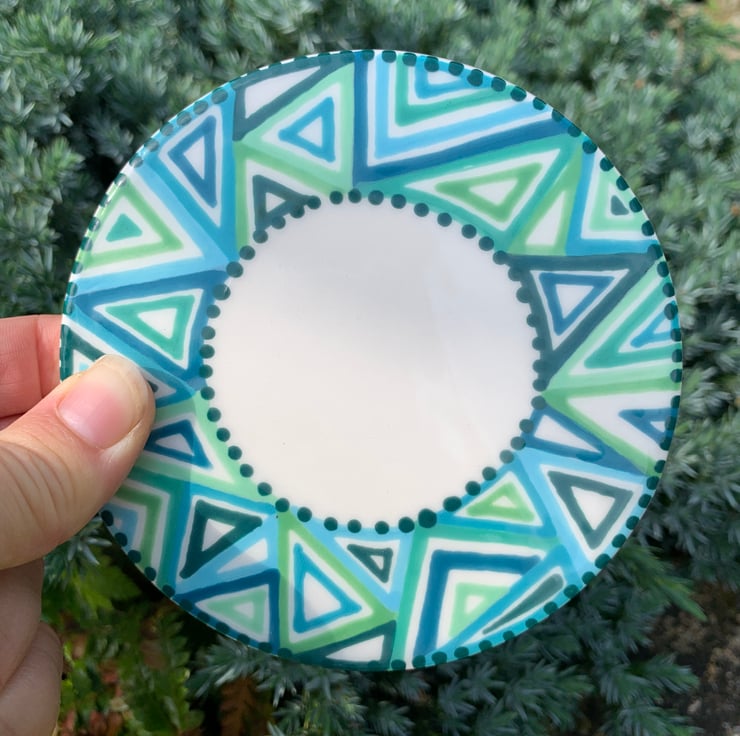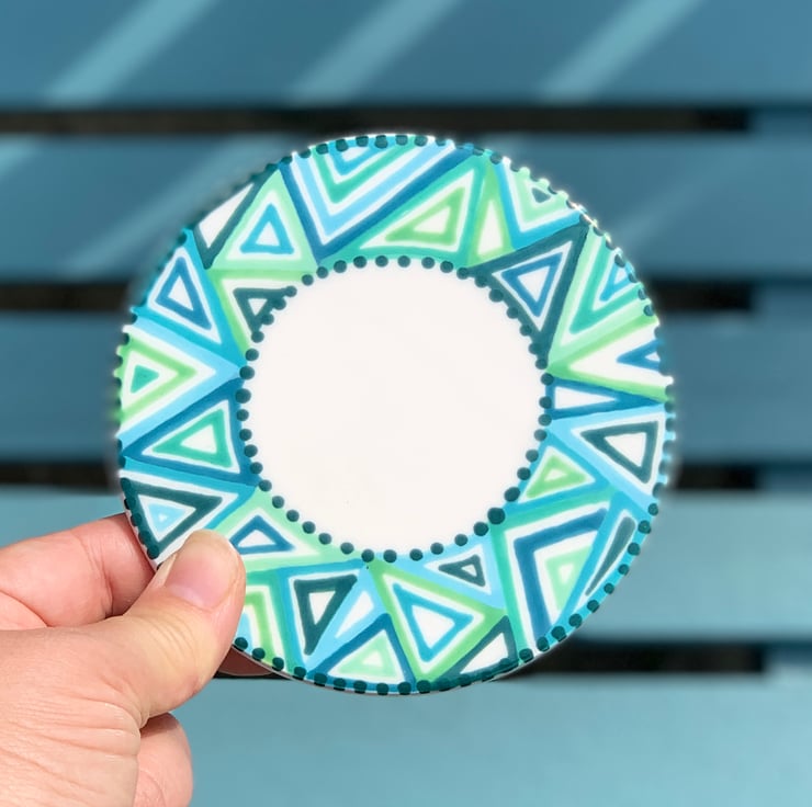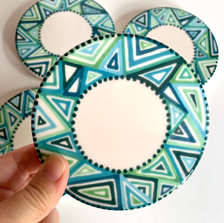 This set of 4 round ceramic coasters have been hand painted using a range of aqua, teal and mint green underglaze tones in a triangular geometric design. They are then glazed and kiln-fired.