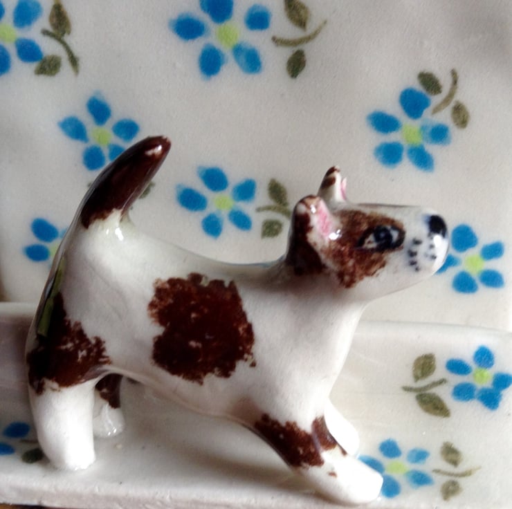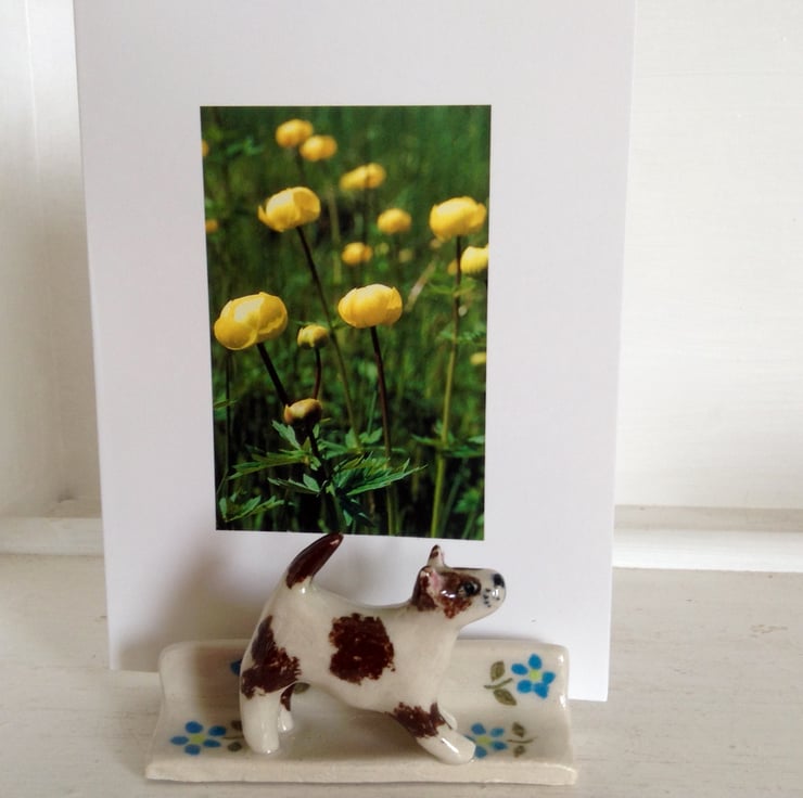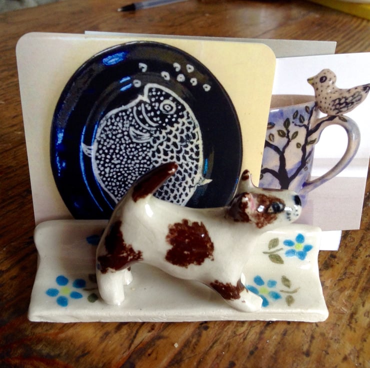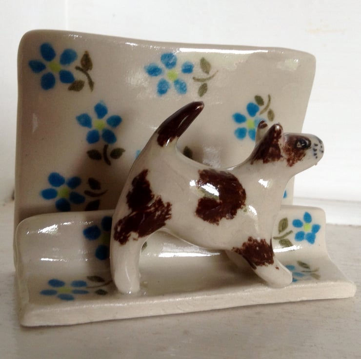 Adorable handmade ceramic card holder for business or greeting cards. The holder is made from tough high fired stoneware clay and has a little hand sculpted brown spotted dog at the front. The front and back are decorated with hand painted blue forget-me-nots. The holder measures 8.5 cms across and is 6.5 cms high and 4 cms deep. It is great for your favourite greetings card or can hold upto 30 average business cards.