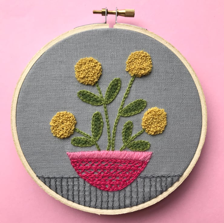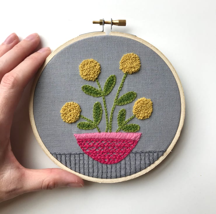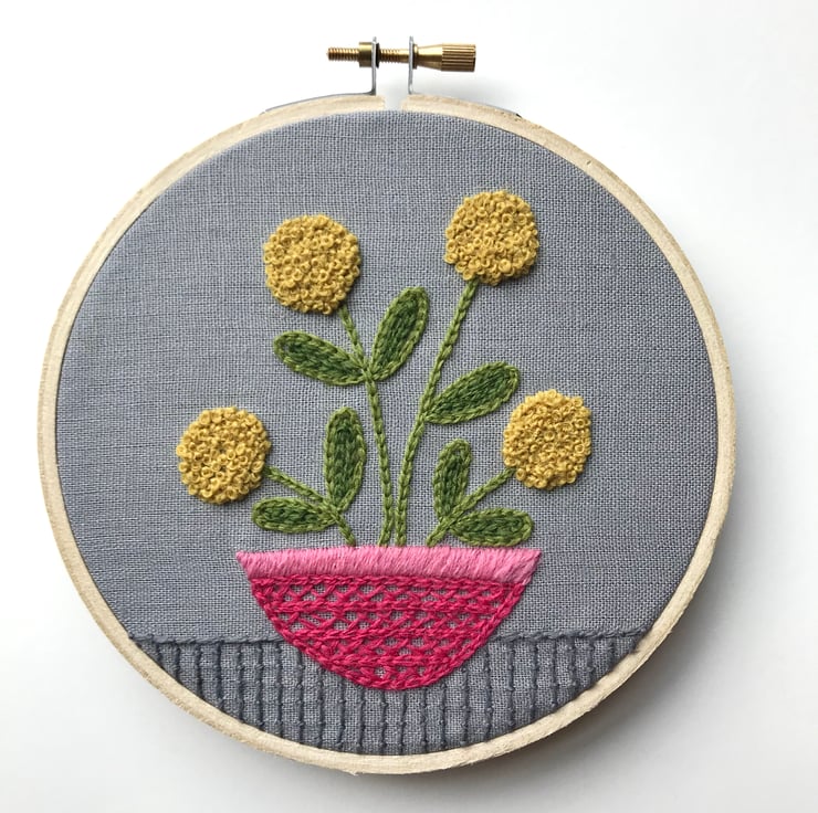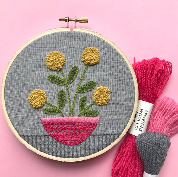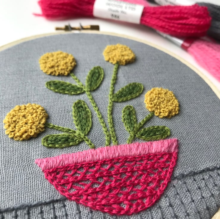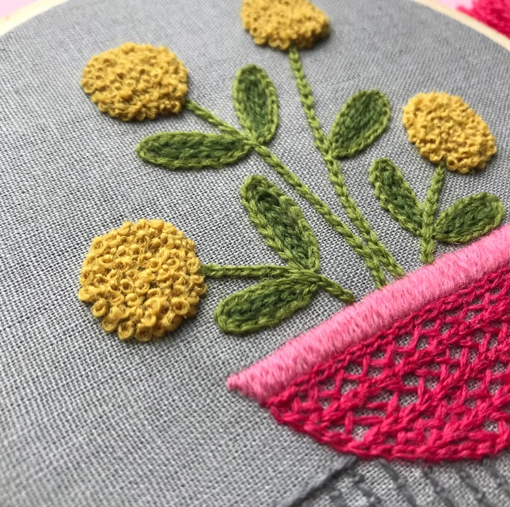 This embroidery piece is hand embroidered using crewel wool which has a fabulous texture. The flower heads are depicted with many French knots, and the stems and leaves are created using chain stitch. The bright pink pot glows against the grey linen background.