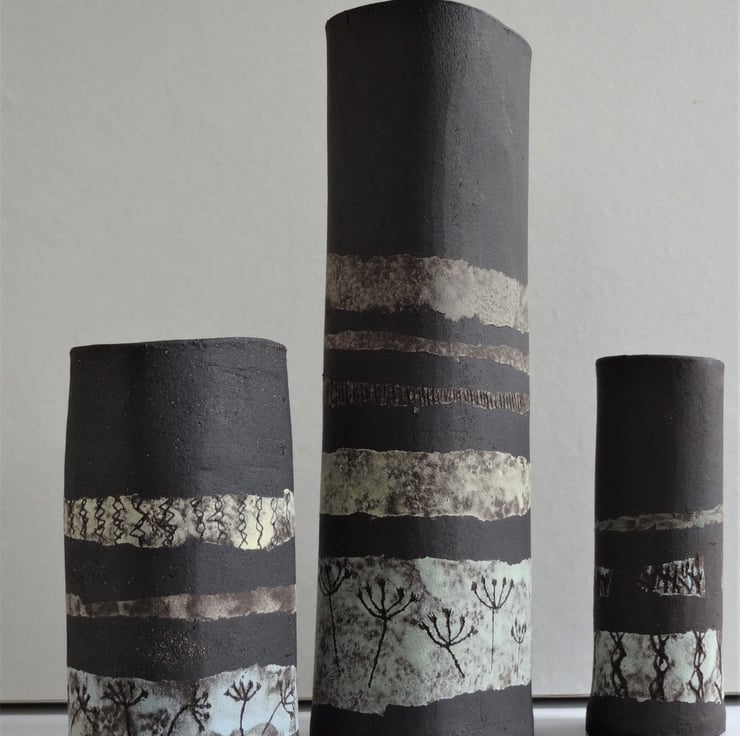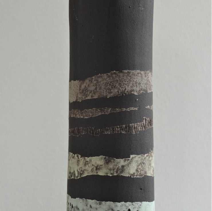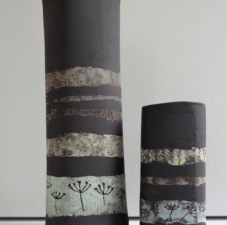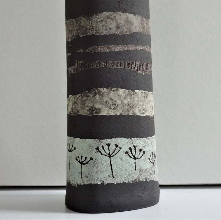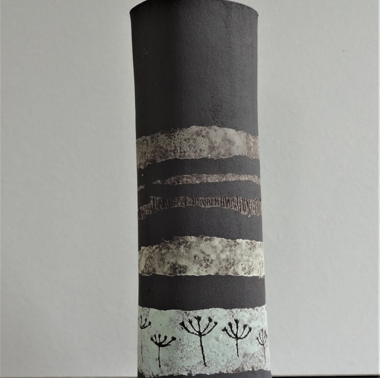 Fiona is a handmade vase in matt black stoneware ceramic with bands of colours in pastel shades as decorative additions fired into the clay. Each of my vases is different, and I use what is known as the sgraffito technique to make further carved marks through the colour while the clay is soft. Fiona has motifs of cow parsley seed heads on a pale turquoise background and bands of lemon and buff with vertical lines. I glaze the interior so that Fiona can be used as a vase to show off your favourite dried or fresh flowers, but the piece can stand alone or with others from the Lucienne Collection as attractive groupings.(My images show how these groupings can look) On the base is my potter's mark of a swallow in flight. Fiona is a soft rectangular shape 15.5 cms cms high and 16 cms around the rectangular base.