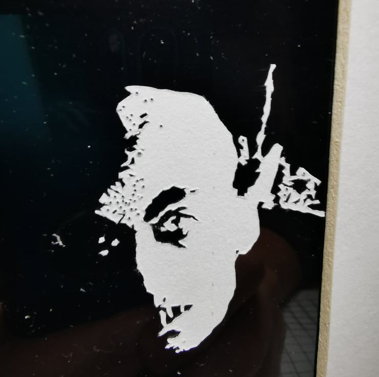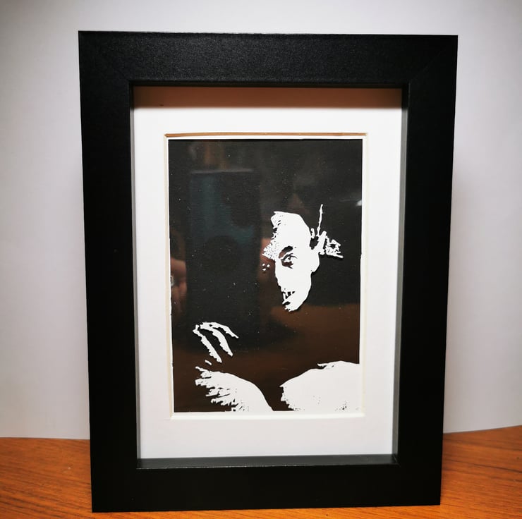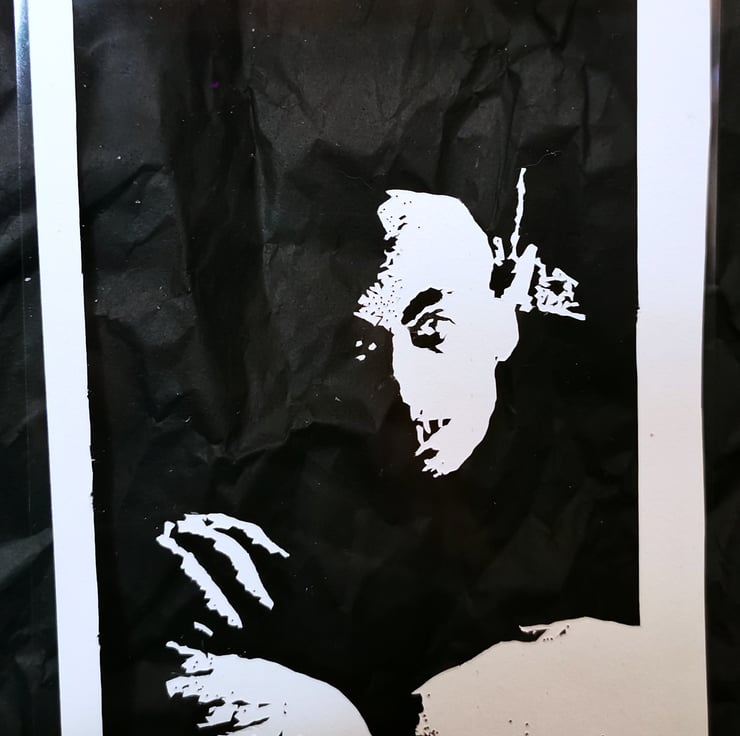 A single layer handmade papercut of Max Schrek as Count Orlok in the seminal vampire film, Nosferatu.