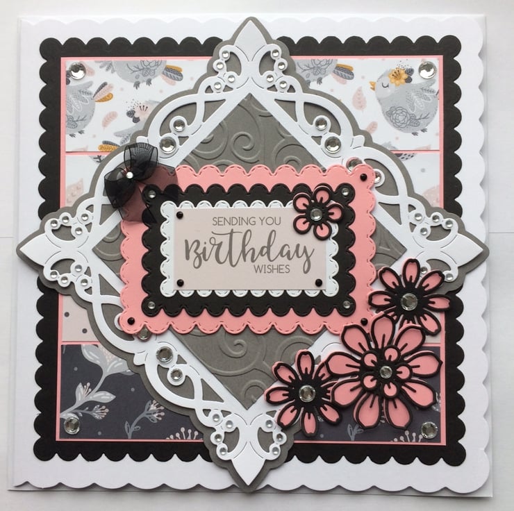 This is a really lovely luxury 3D handmade greeting card. The design is a beautiful palette of pink, white and black multiple 3D layers, with shabby chic style papers and 3D flowers. The sentiment on the front says "Sending You Birthday Wishes".