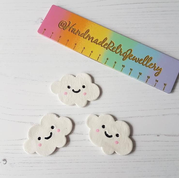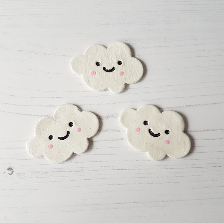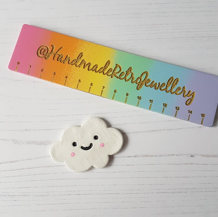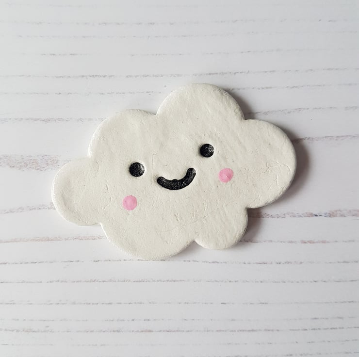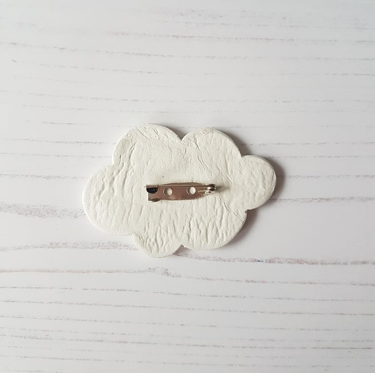 The cloud is made from air dry clay, then finished off using a dryer, and finally hand painted detail is added using acrylic paint. The piece is then sealed with a gloss varnish to protect, and can be finished on the back with either a brooch pin or magnet, to complete your bespoke piece