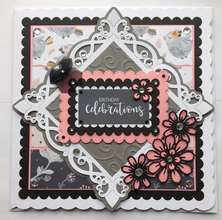 This is a really lovely luxury 3D handmade greeting card. The design is a beautiful palette of pink, white and black multiple 3D layers, with shabby chic style papers and 3D flowers. The sentiment on the front says "Birthday Celebrations".