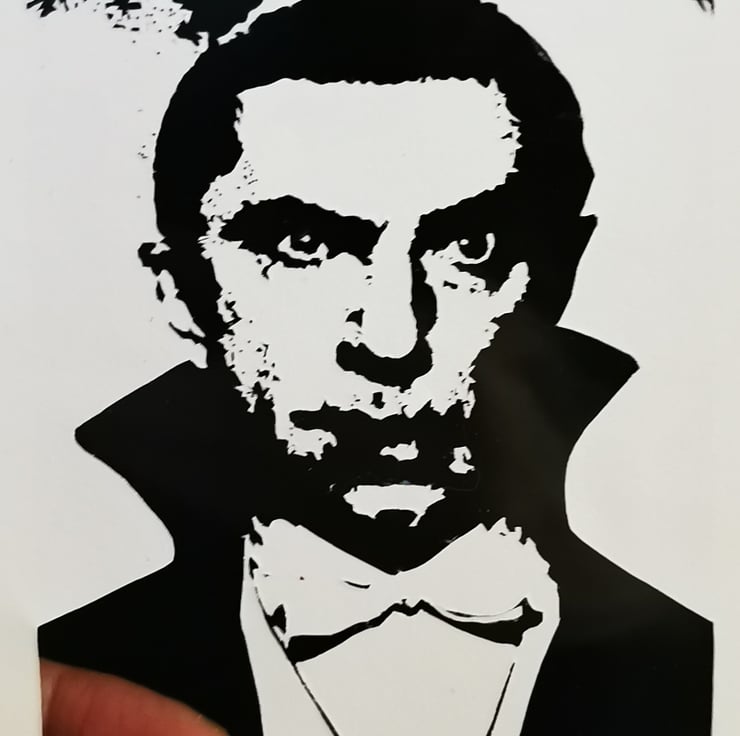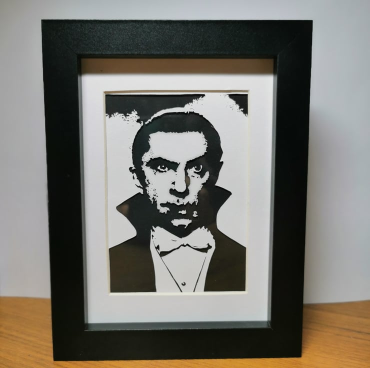 From the 1931 film, this hand cut piece of paper art portrays Bela Lugosi in his iconic role as Count Dracula.