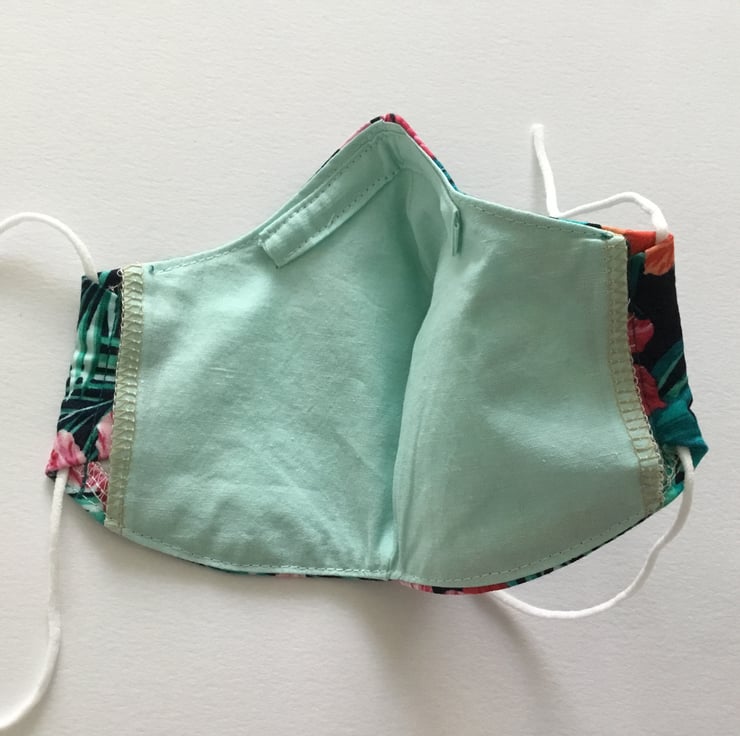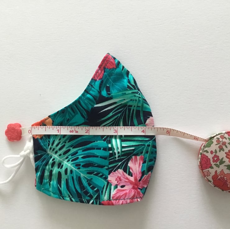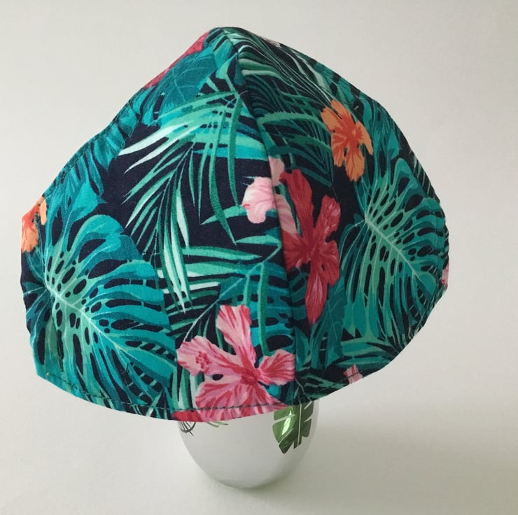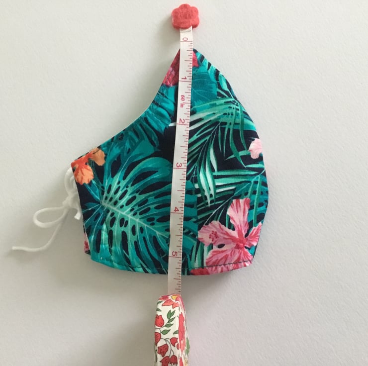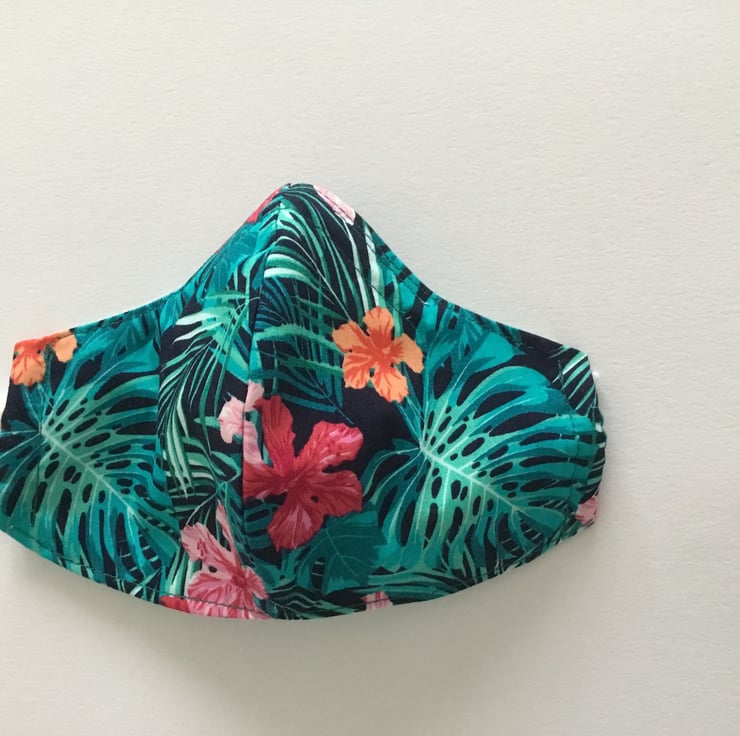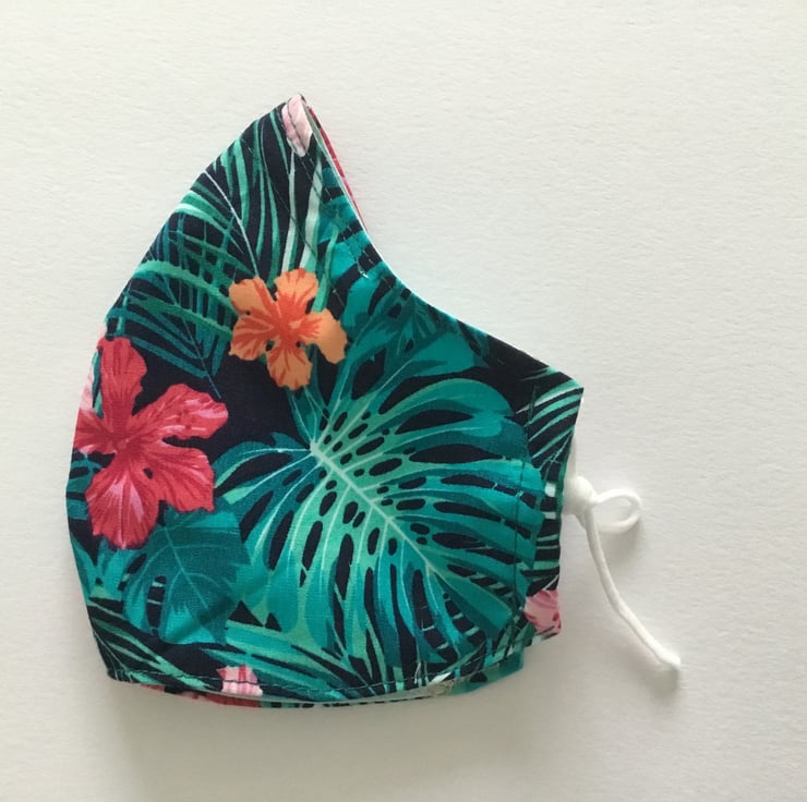 Bright tropical fabric face covering with 3 layers of cotton fabric, removable nose wire which should be removed before washing and elastic ear loops with 30cm each side for you to adjust to size. You can choose to use this covering with a filter as there is an opening each side.