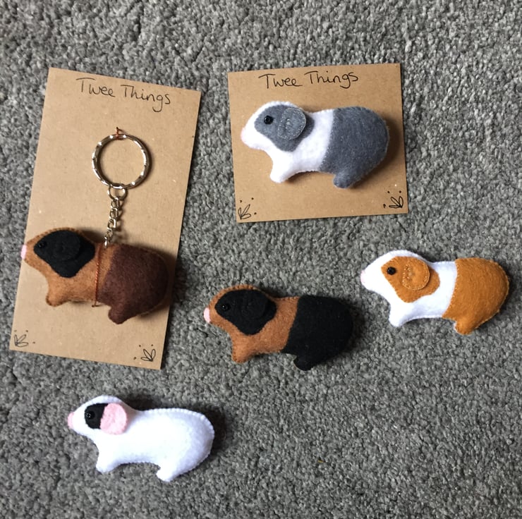 Super cute handsewn felt guinea pigs, available in different colours and as keyring or brooch.
