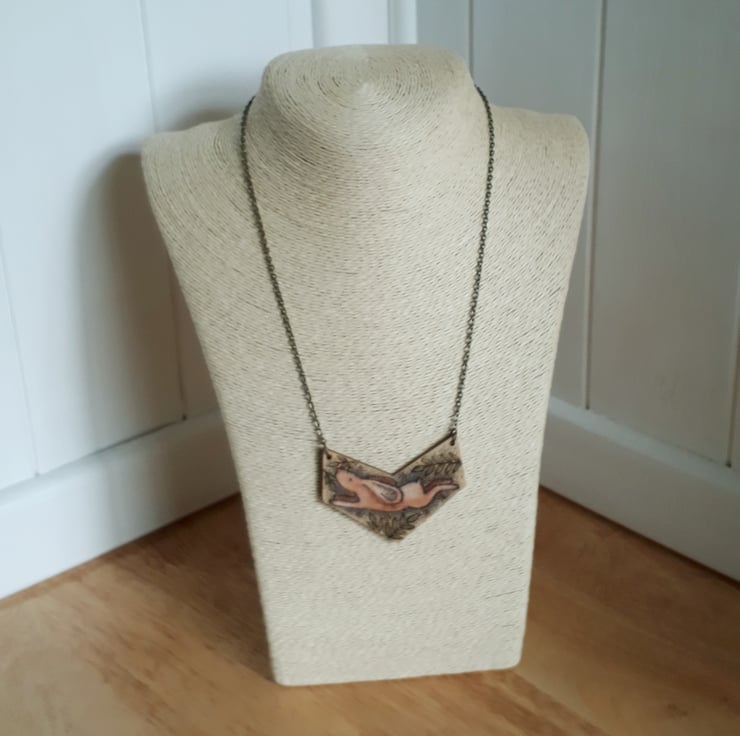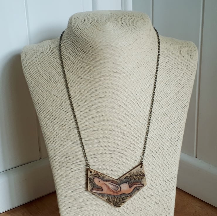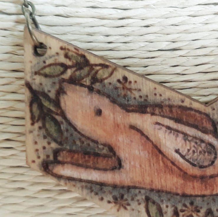 Wooden pendant illustrated with a hare using pyrography (wood burnng).