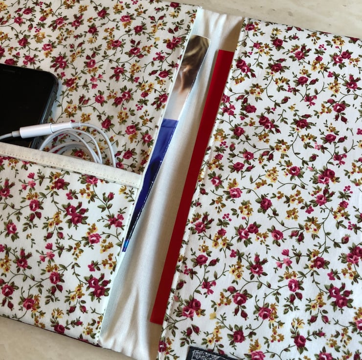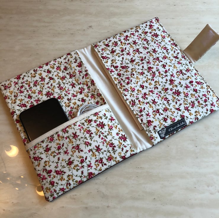 There are 3 pockets inside and sewn with floral fabric. The pocket on the right is sewn with Velcro which allows to secure your device in place. The 2 other pockets on the left are for holding your accessories or documents. There is a fabric flap with Velcro for closure.