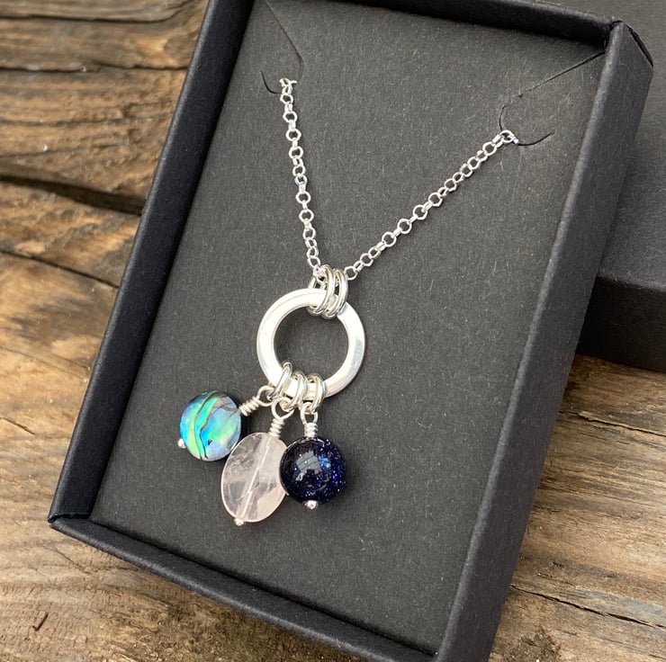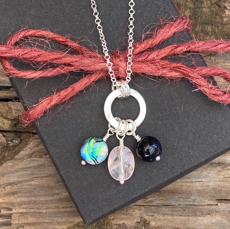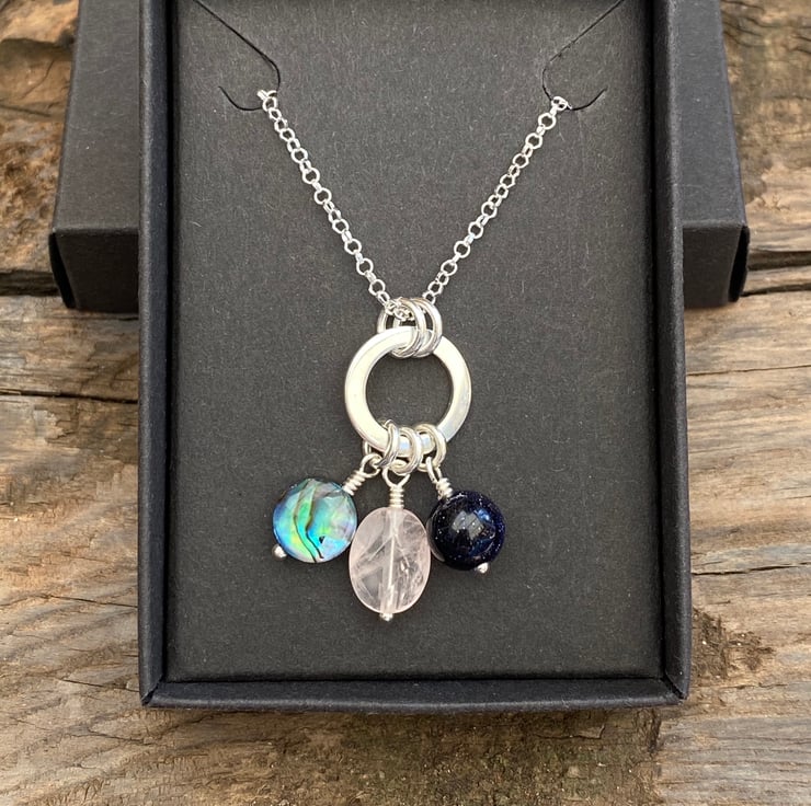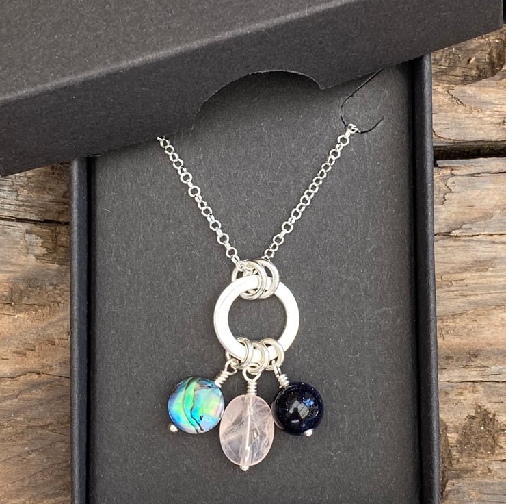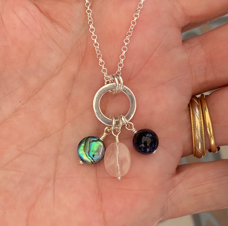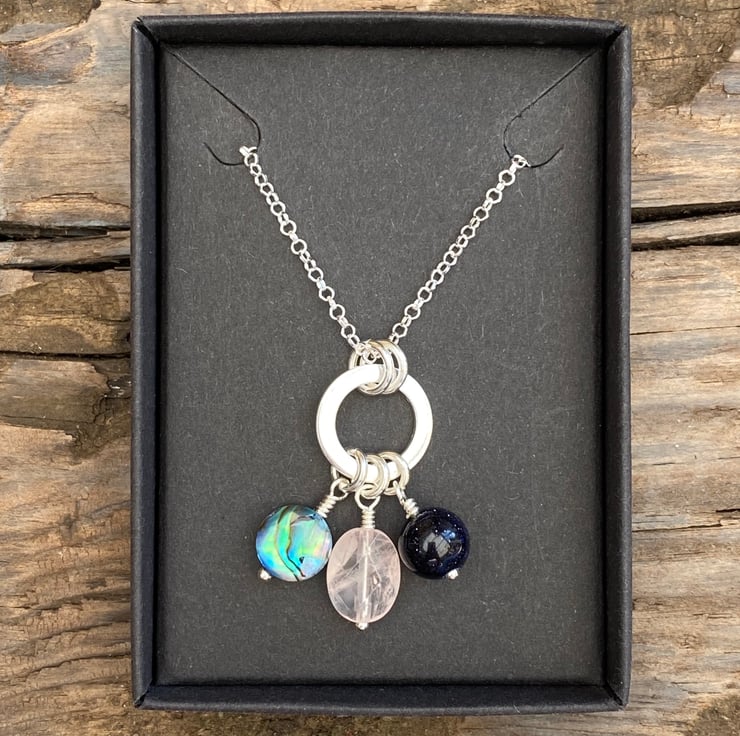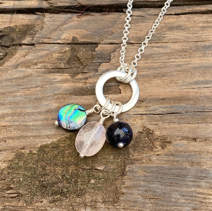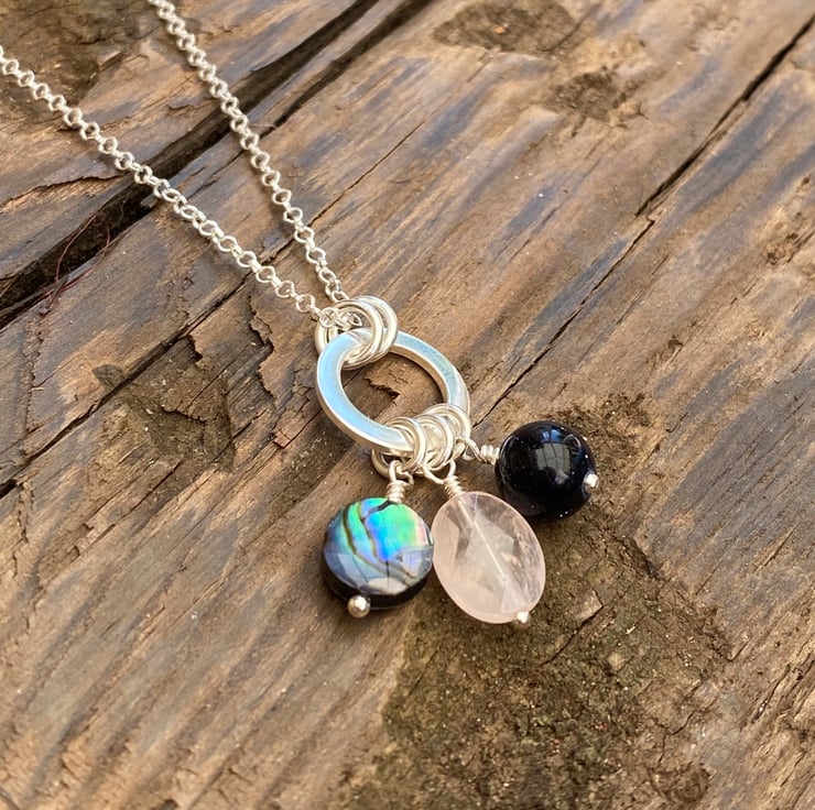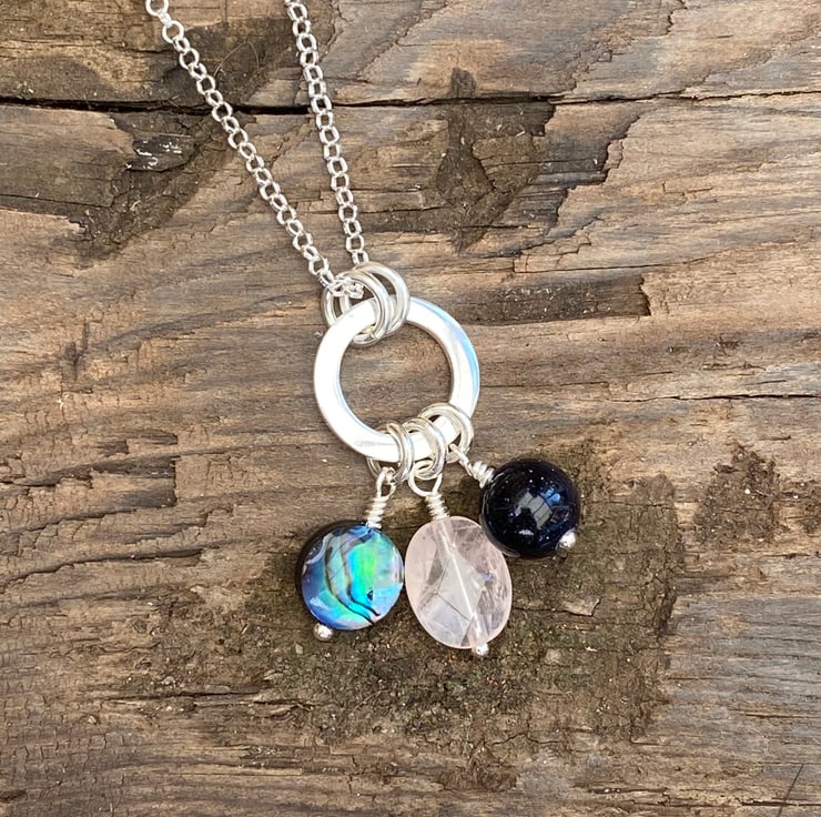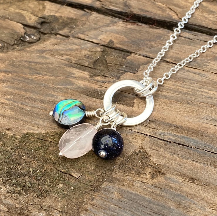 Abalone shell, faceted oval Rose Quartz & blue goldstone round beads are all hand wired on to sterling silver headpins, attached to a sterling silver washer. Hangs from a sterling silver belcher chain (also known as rolo chain) in a voice of lengths.