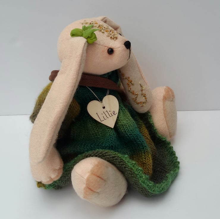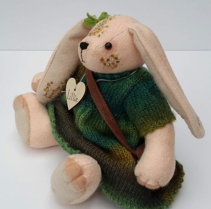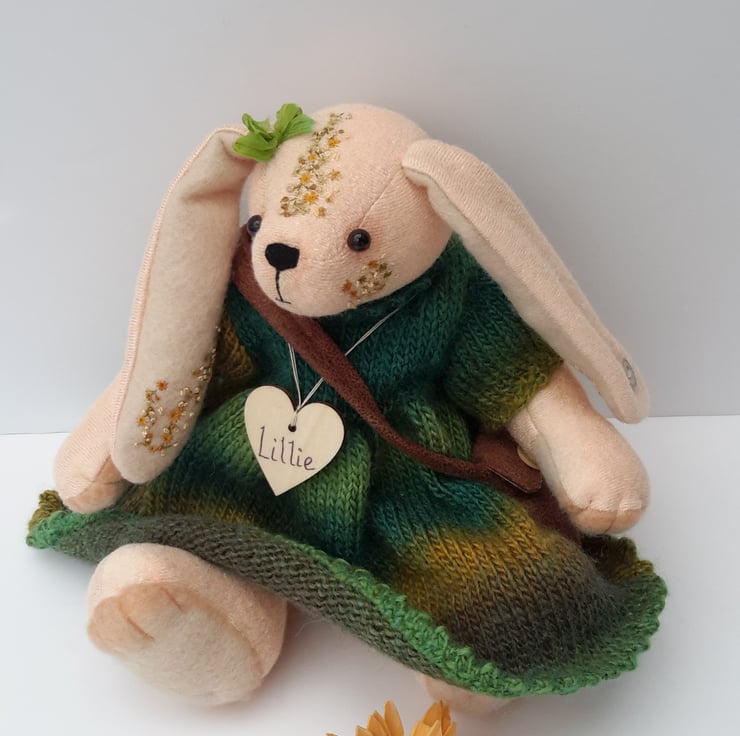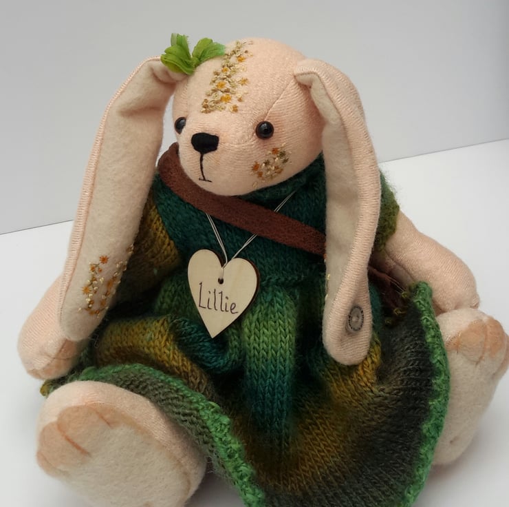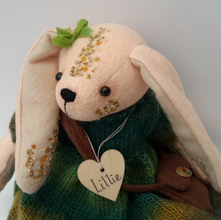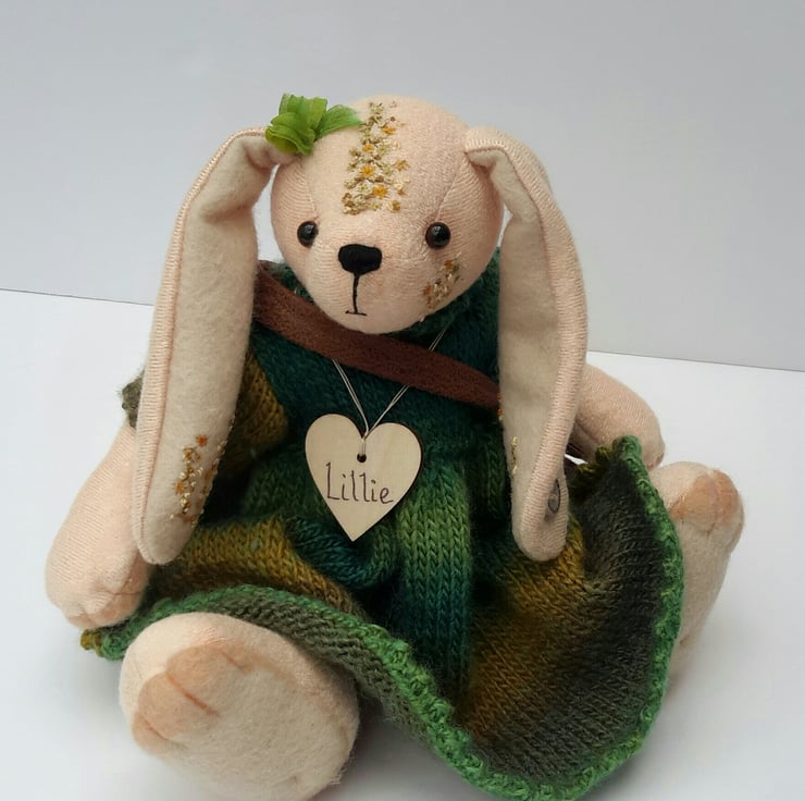 My name is Lillie, I am a one of a kind collectable bunny, a dressed and hand embroidered rabbit, created by Bearlescent.