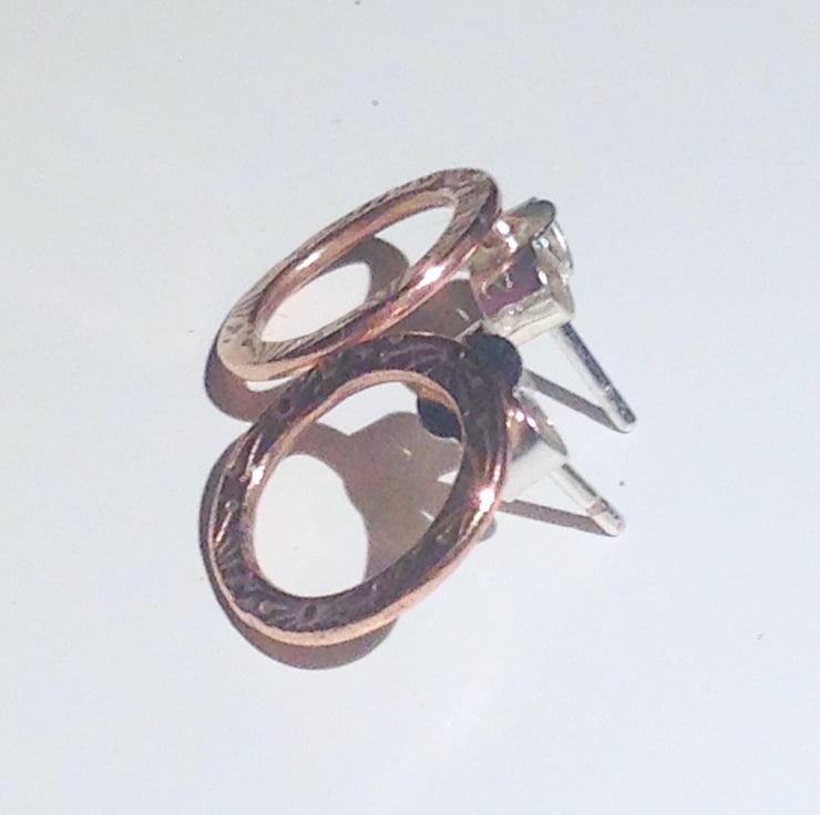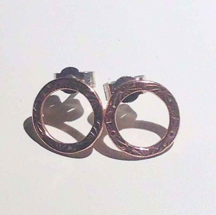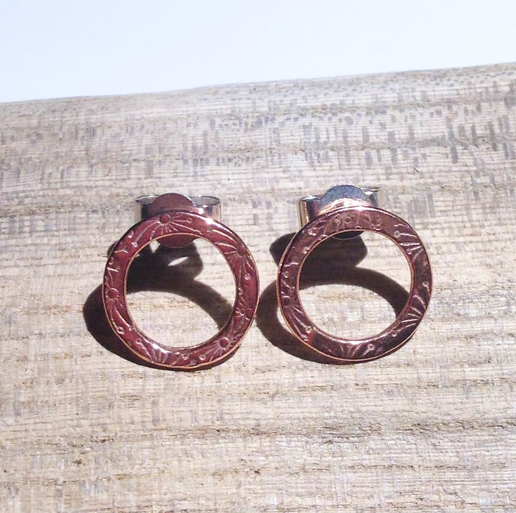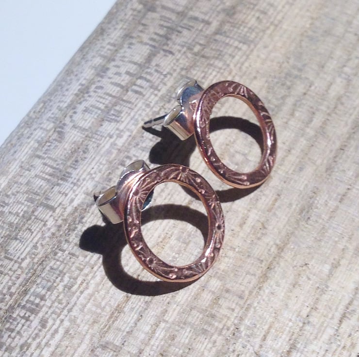 These lovely little earrings are handcrafted from copper in a circular design with an attractive stamped pattern.