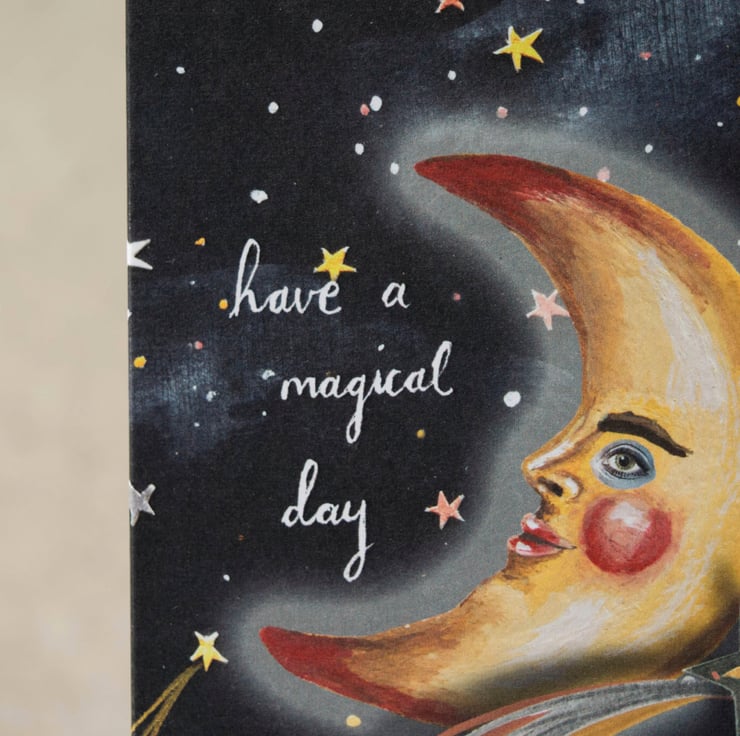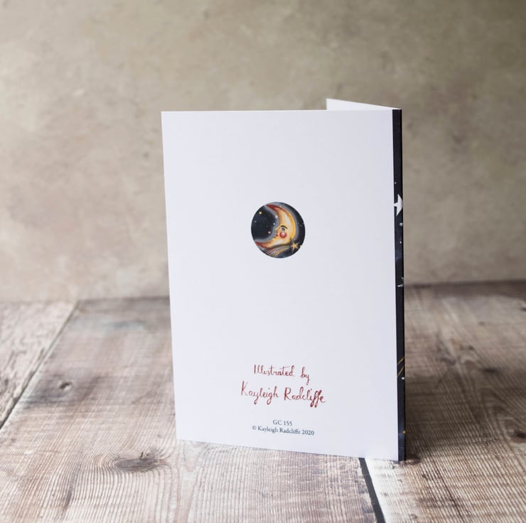 A magical crescent moon greeting card which can be used for many occasions- Birthday, anniversary, or simply send it to a friend or loved one to say hello.