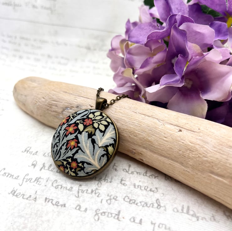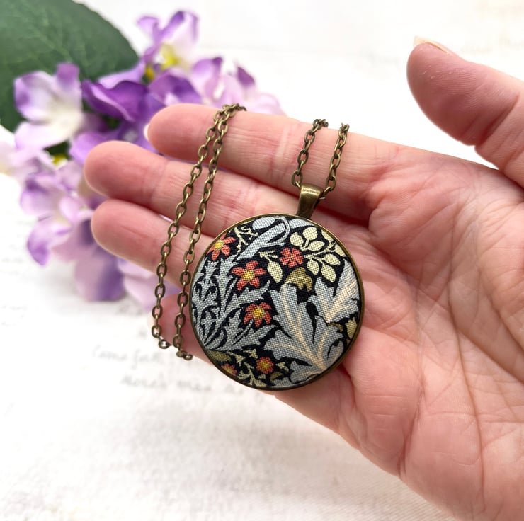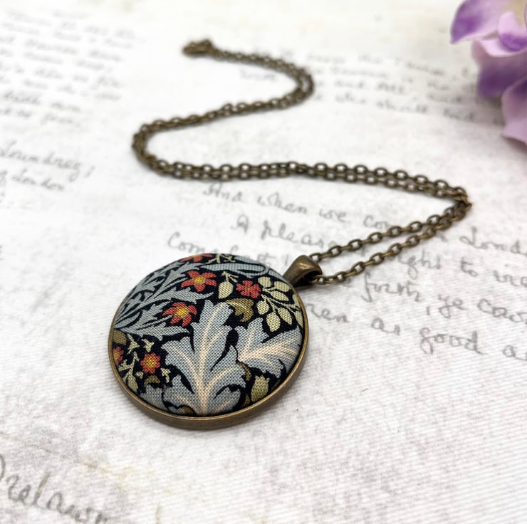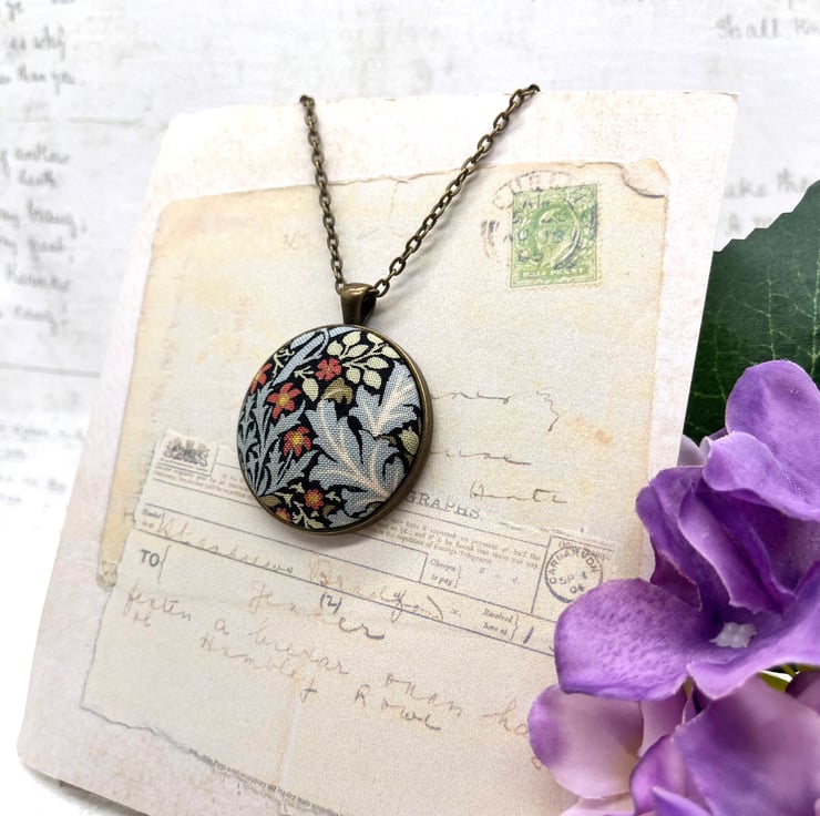 This sumptuous fabric button pendant, has been made using a beautiful section of William Morris & Co 100% cotton fabric from Moda, in collaboration with the Victoria and Albert Museum.