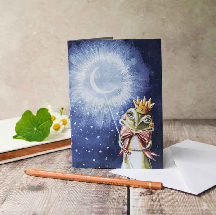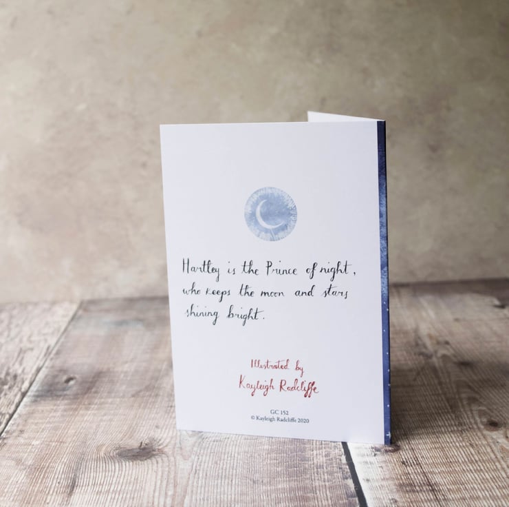 Inside is blank to let you add your own personal message. The back of the card reads "Hartley is the Prince of night, who keeps the moon and stars shining bright."