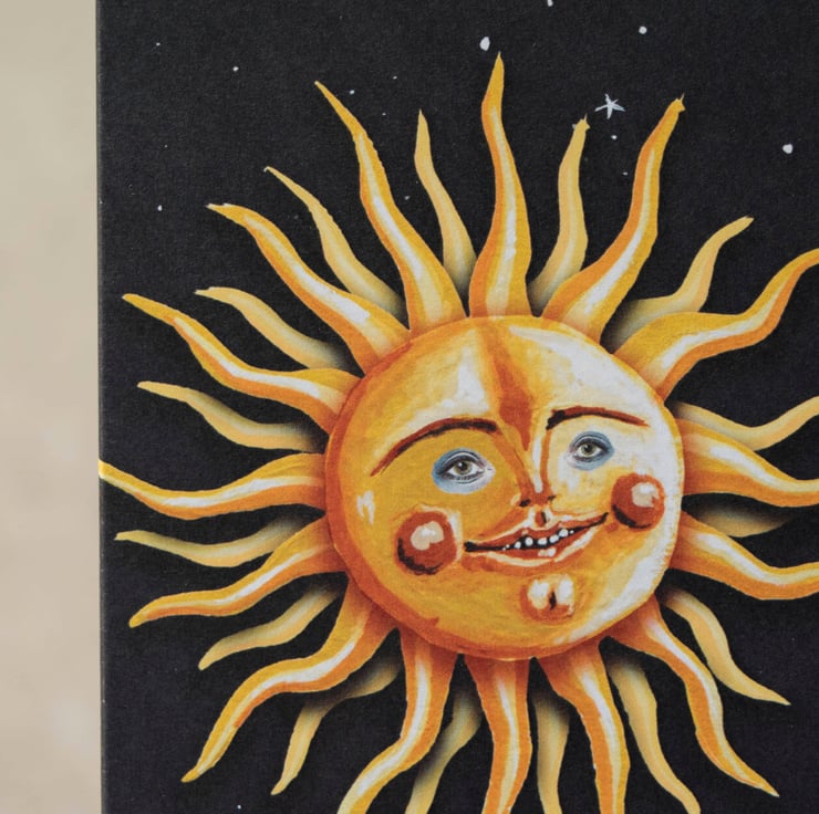 Comes with a golden toned envelope. Printed within the UK upon an uncoated card stock.
