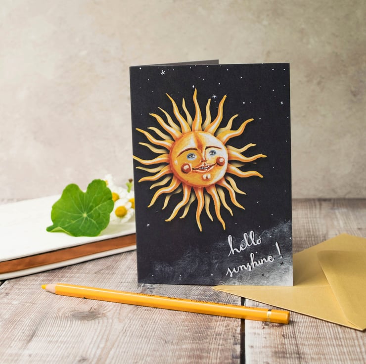 The front of the card reads "Hello sunshine". Inside is blank to let you add your own personal message.