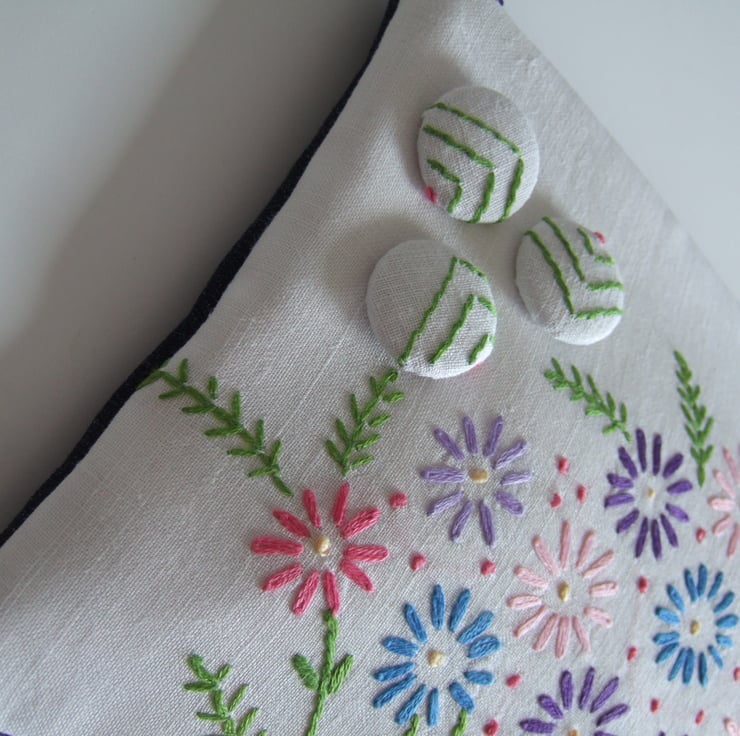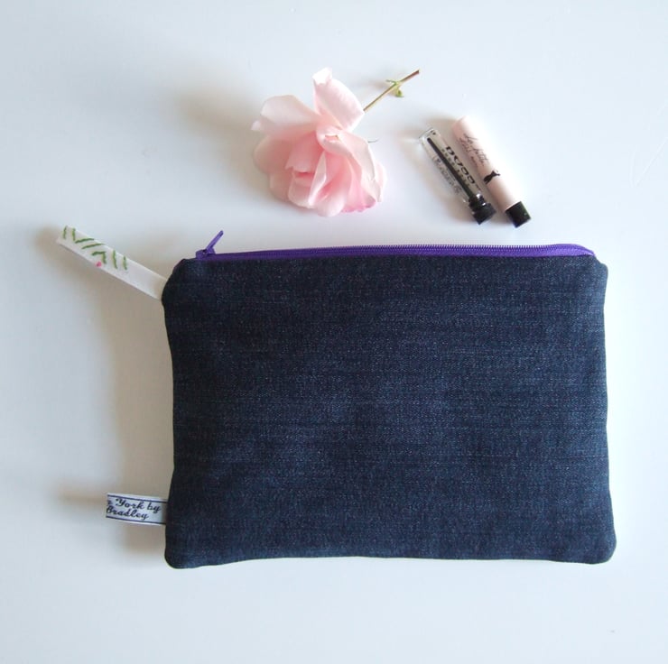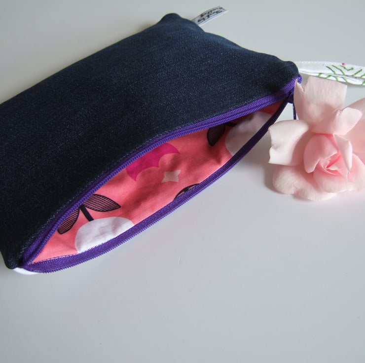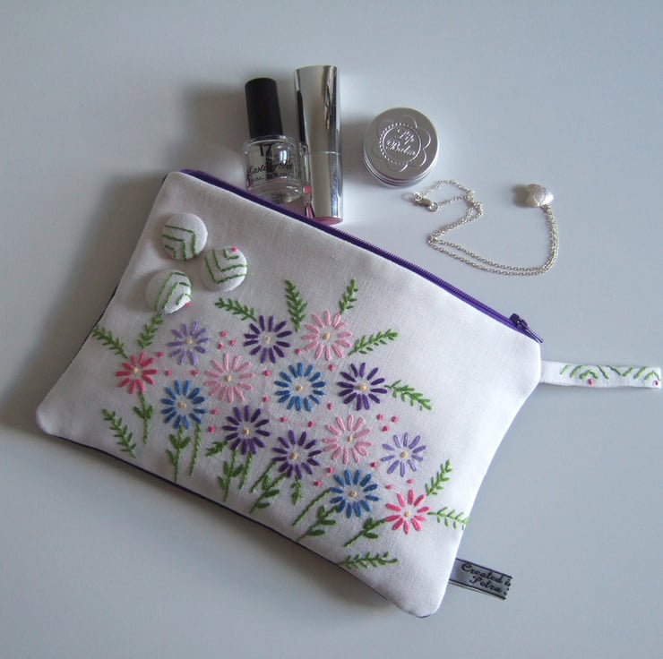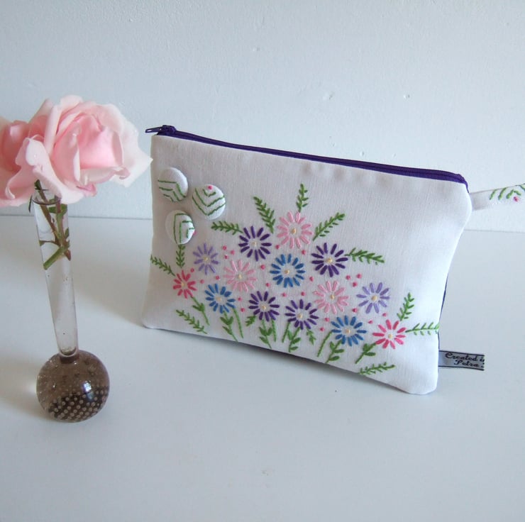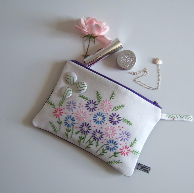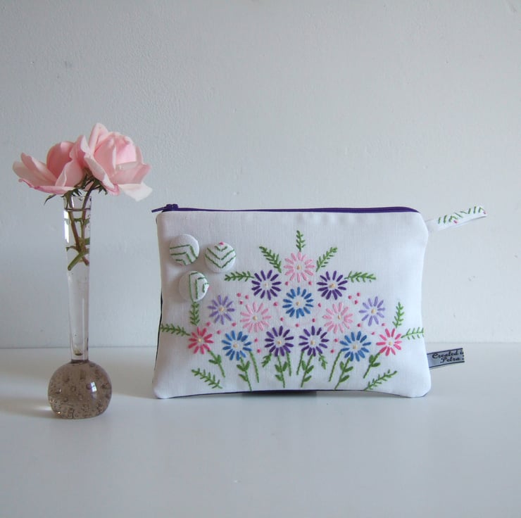This sweet little zip up bag is made from a section of a vintage tablecloth with a front design of a lovely old hand embroidered spray of flowers. Lovely to use as a pretty make up or cosmetics bag, it would also make a fresh Summer purse, or a tiny clutch bag. There are 3 covered buttons on the front, and the back is made from blue recycled denim to give it some edge. It would make a great present for a vintage fabrics lover, to take to a Summer wedding, or as a virtual hug for a friend.
