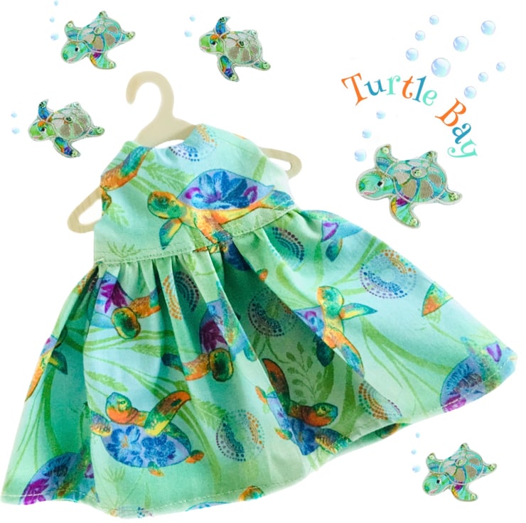 A beautiful little dress, in a turtle print fabric to fit the Mulberry Green characters. The dress is made from best quality cotton, has a full skirt, a lined bodice and comes on a cute little wooden hanger. It matches the Turtle Bay cardigan.
