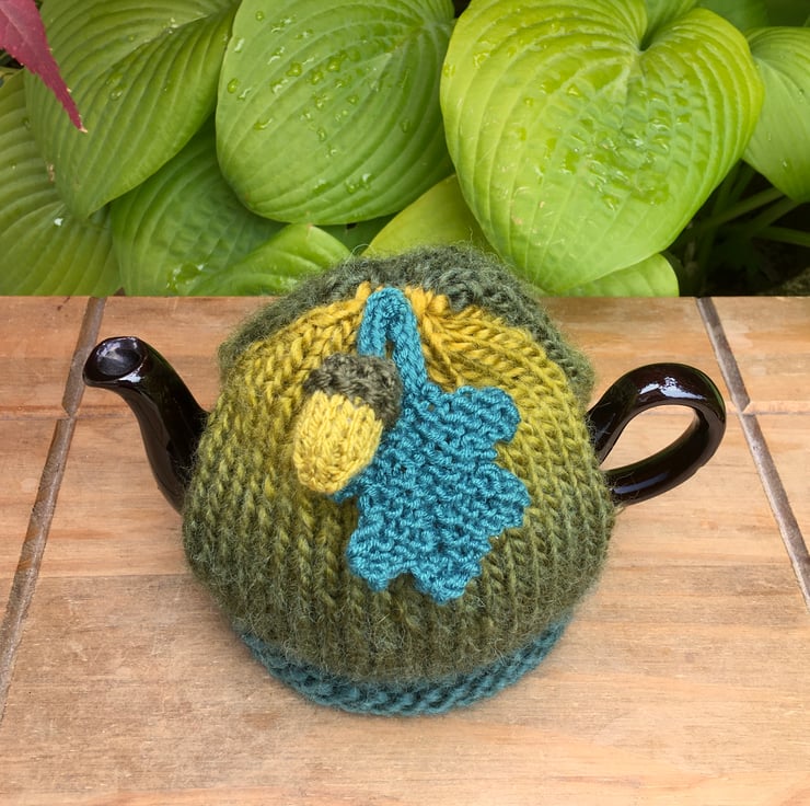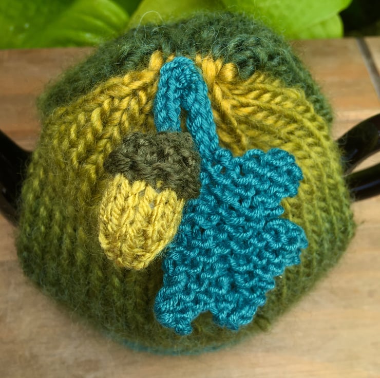The small teapot cosy has a hand knitted acorn attached in complementary colours, lime green and olive green. There is also a knitted teal oak leaf.
