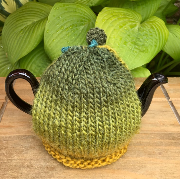 This bright and cheerful hand knitted one cup tea cosy has been lovingly made using a multicoloured wool mix gradient yarn in shades of mustard, teal and green.