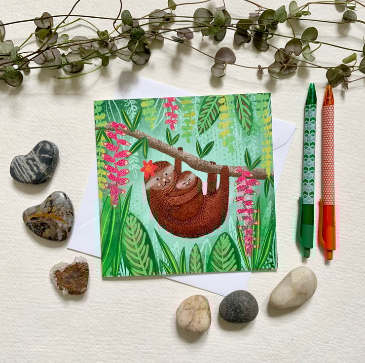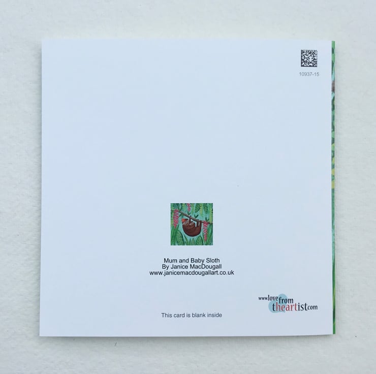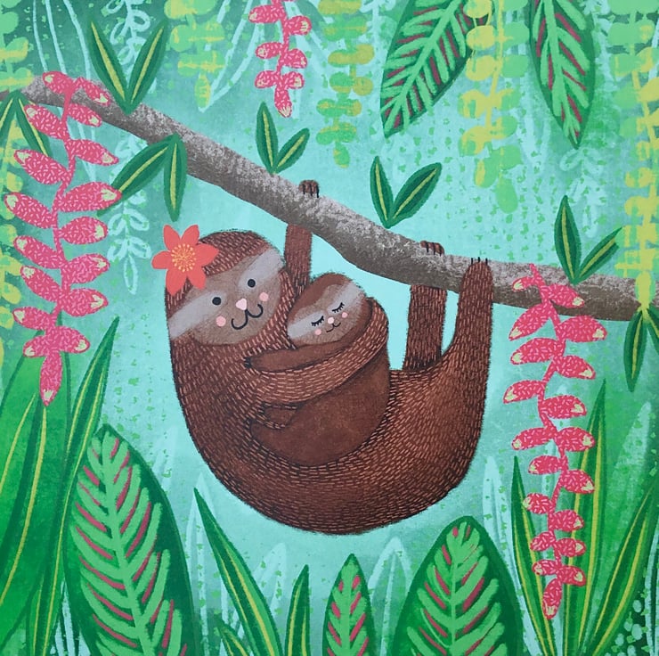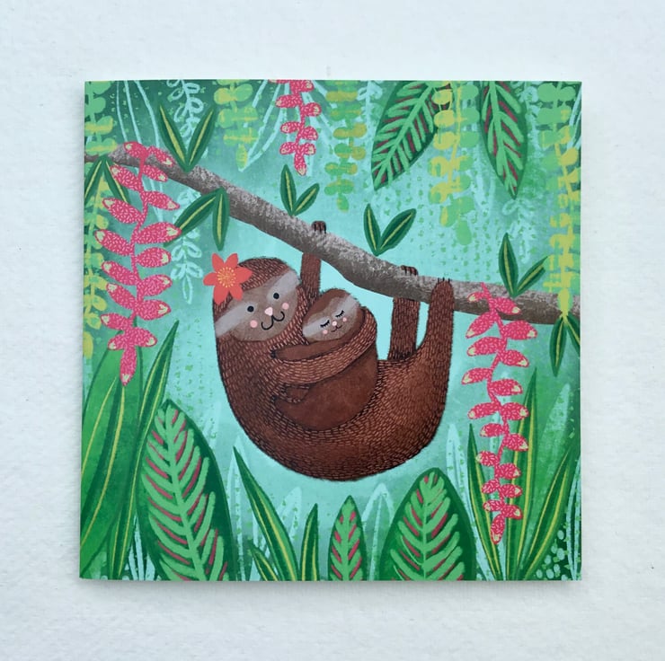 This is a blank greetings card, made from one of my original paintings, it measures 14.5x14.5cm and comes with an envelope. It would make a lovely Mother’s Day or birthday card as it features a mum and baby sloth