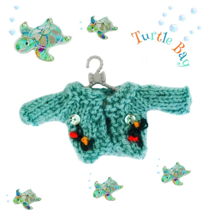 A sweet little turquoise embroidered and sequinned cardigan made especially to fit the Little Hugs dolls or baby Daisy. The cardigan is hand knitted and comes on a cute little hanger. It matches the Turtle Bay dress.