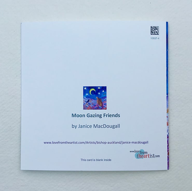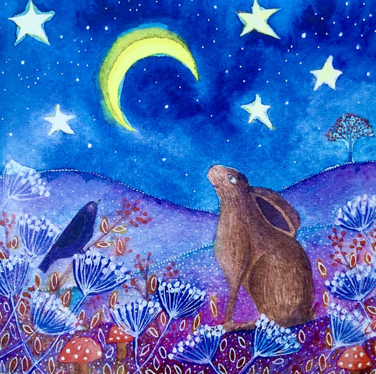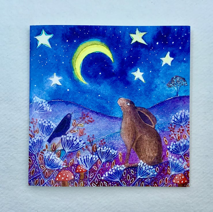 This card has been printed from an original painting that I did, featuring a hare and a blackbird gazing at the moon together. It is a blank greetings card making it suitable for a variety of occasions. It measures 14.5x14.5 cm and comes with an envelope.