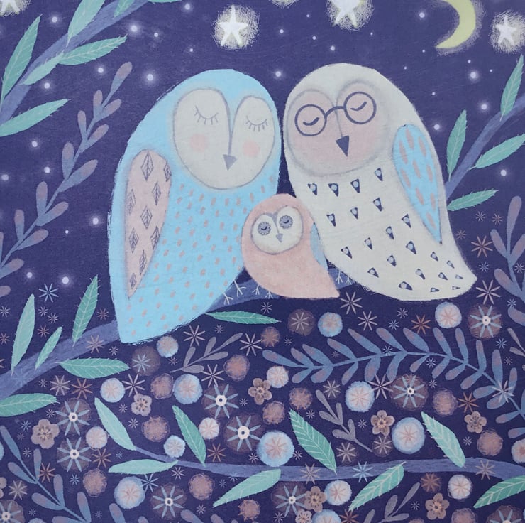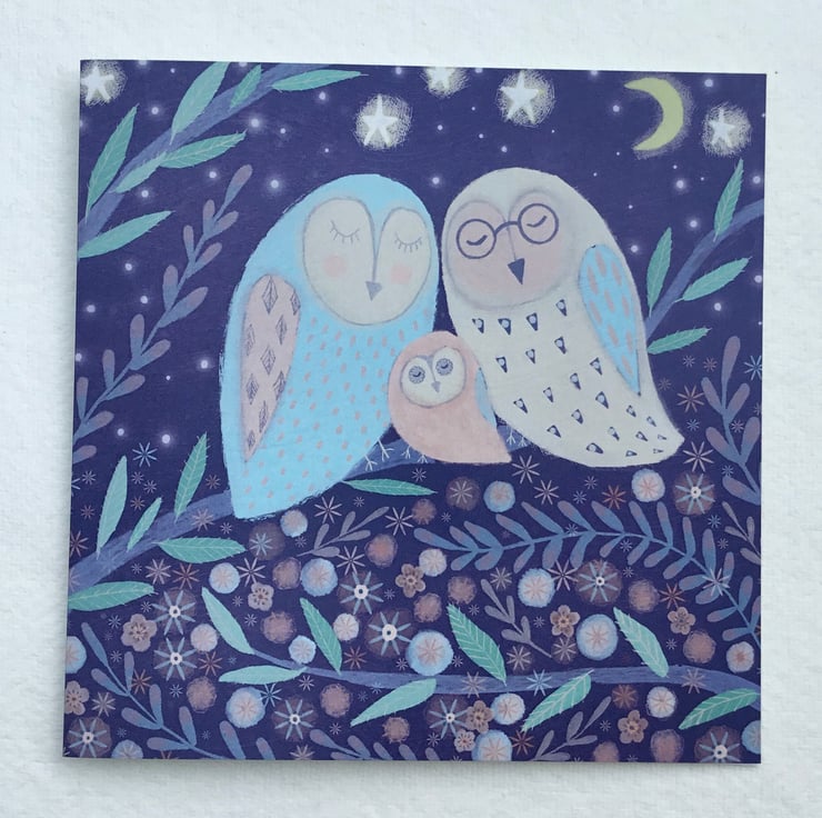 This card has been printed from an original painting that I did, featuring a cozy owl family huddled together. It is a blank greetings card making it suitable for a variety of occasions. It measures 14.5x14.5 cm and comes with an envelope.