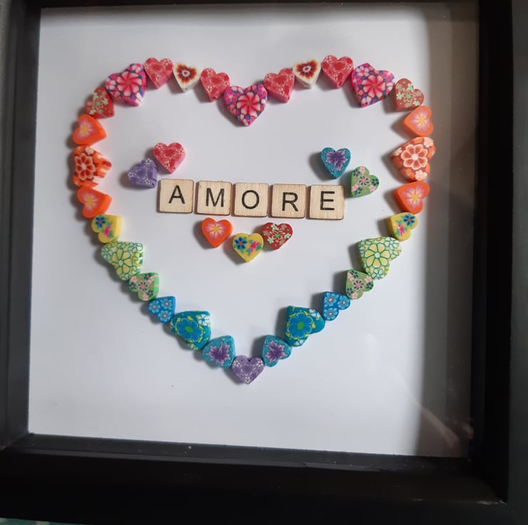 A beautiful heart shape outline composed of carefully selected polymer clay heart canes in every colour of a rainbow is the focal point of this black box frame.