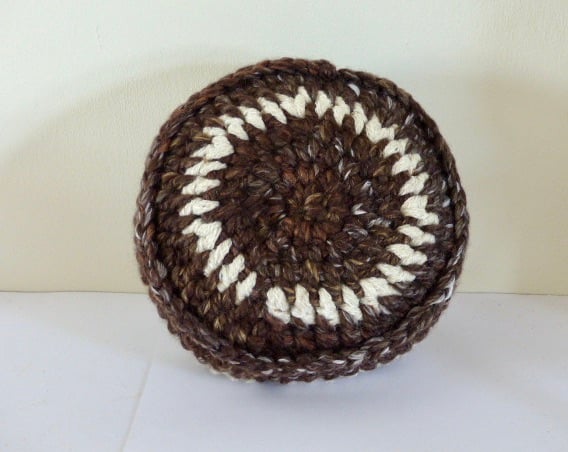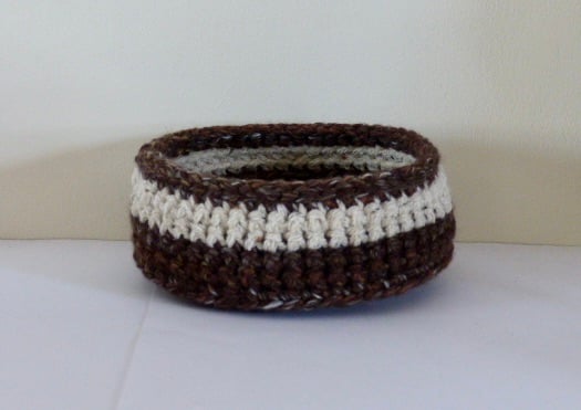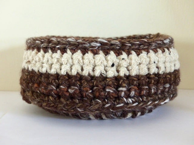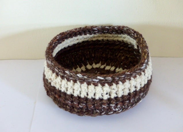 A shallow crocheted bowl/basket in super chunky yarns. A brown flecked yarn and a contrasting beige yarn. It measures approximately 18cm in diameter by 7cm high and is ideal for the storage of small craft items etc.