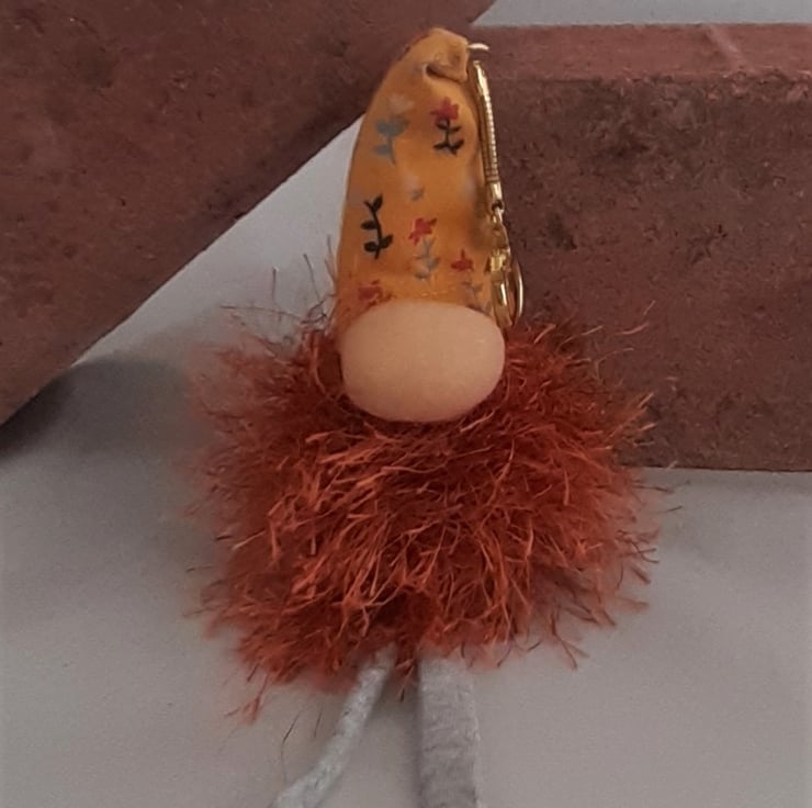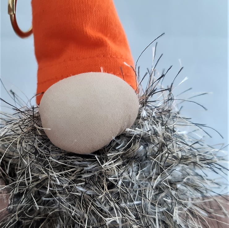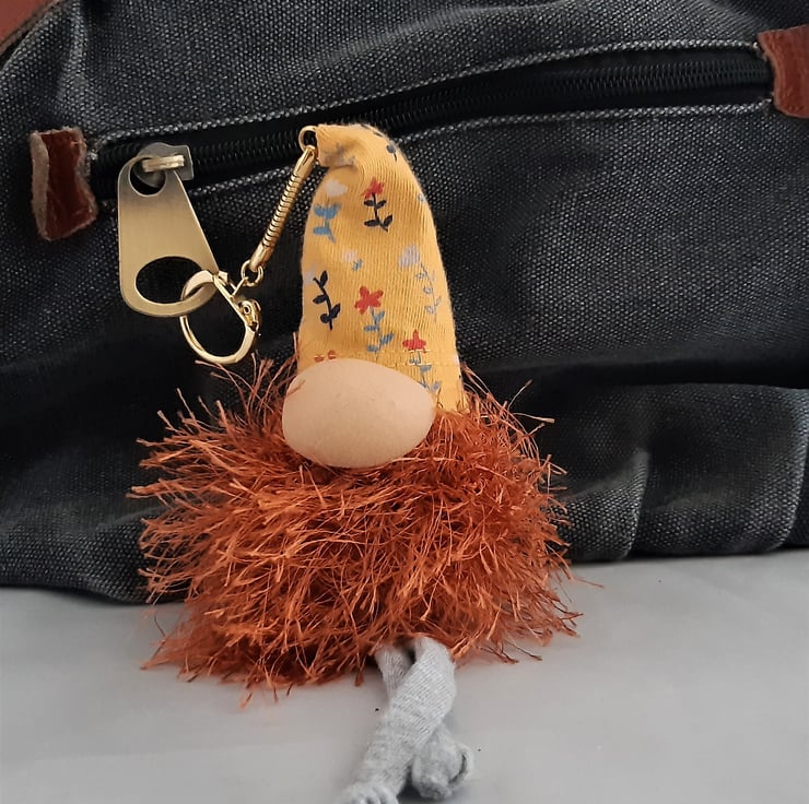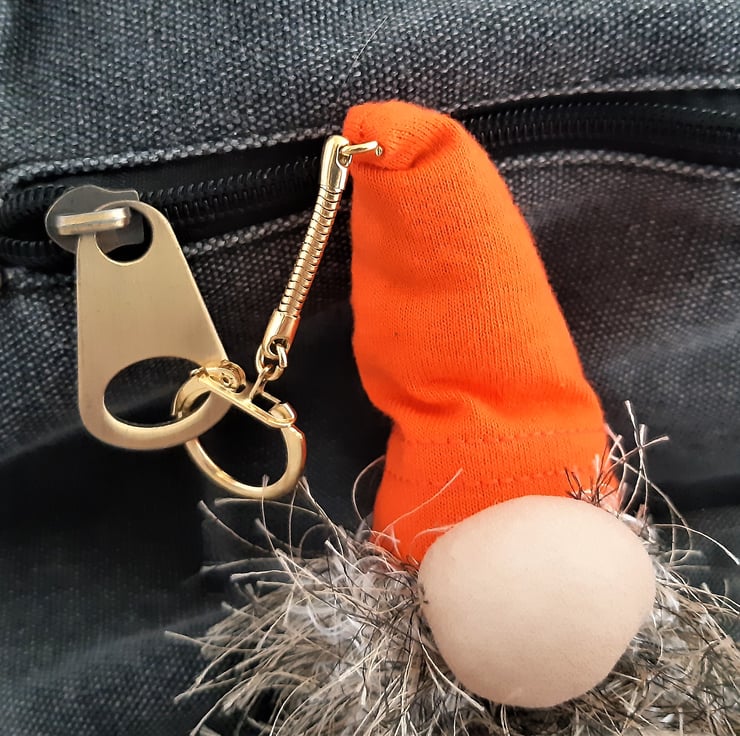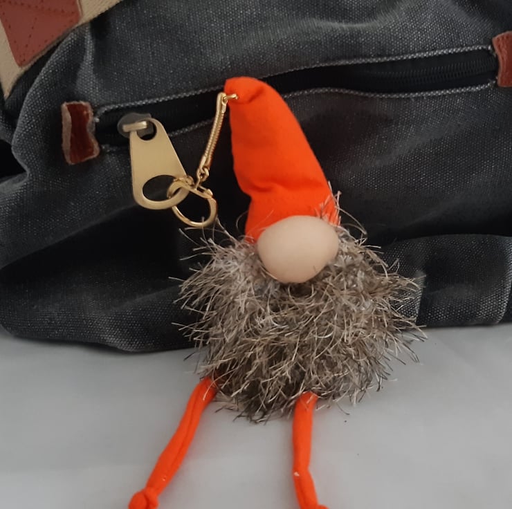 This adorable hand-stitched gnome is a delightful, handcrafted item that doubles as a keyring or bag charm. Each gnome features a gorgeous hand-knitted beard made from eyelash wool, often found in charity shops, adding a cozy, textured touch.