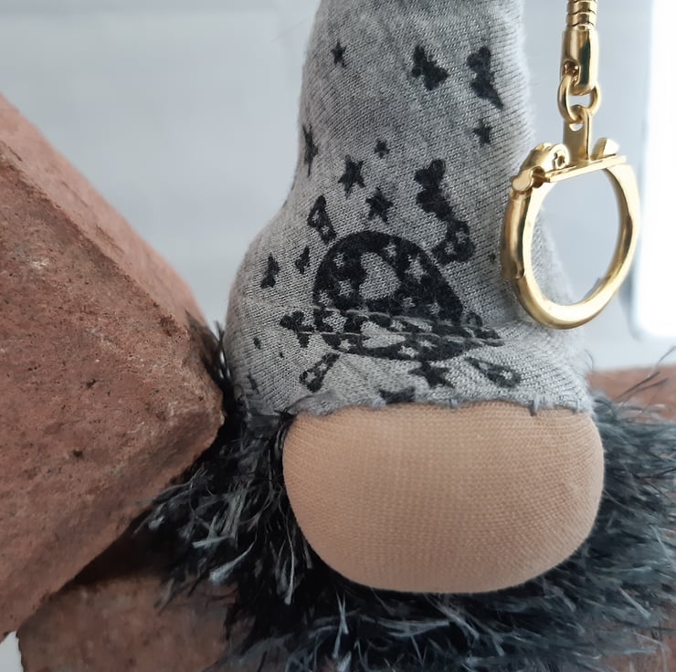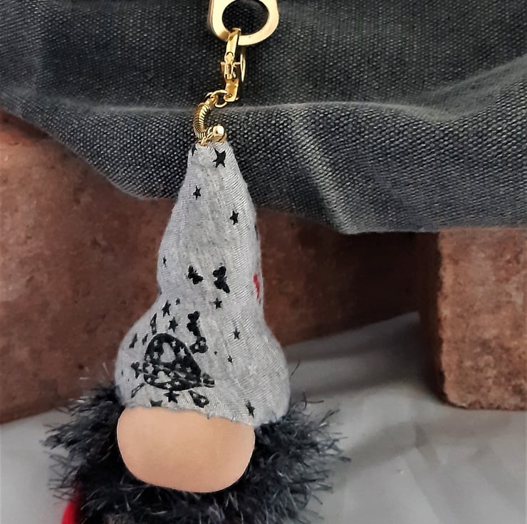 This adorable hand-stitched gnome is a delightful, handcrafted item that doubles as a keyring or bag charm. Each gnome features a gorgeous hand-knitted beard made from eyelash wool, often found in charity shops, adding a cozy, textured touch.