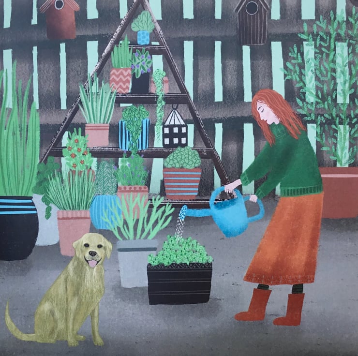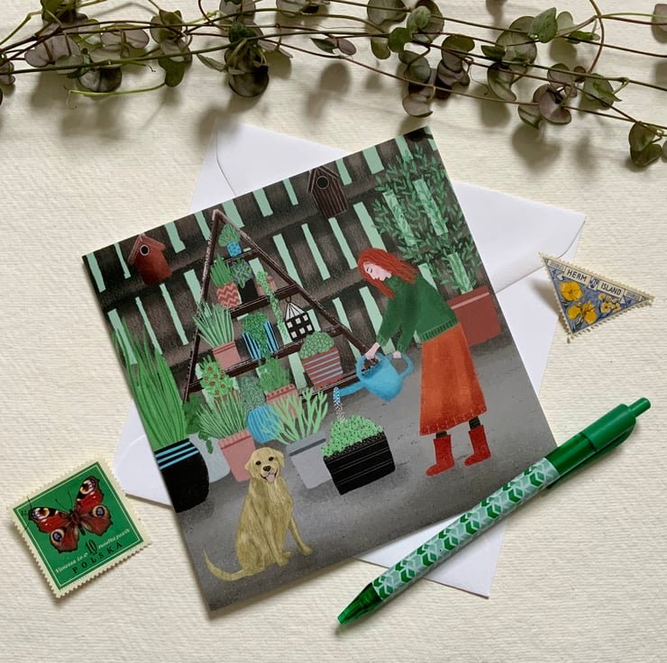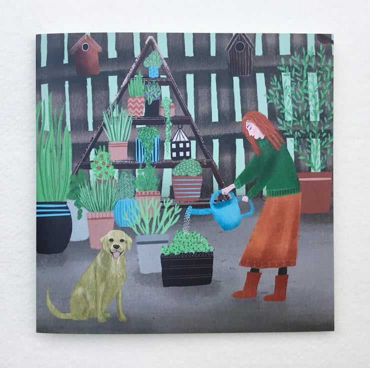 This card has been printed from an original painting that I did, featuring a lady watering the garden supervised by her Labrador dog. It is a blank greetings card making it suitable for a variety of occasions. It measures 14.5x14.5 cm and comes with an envelope.