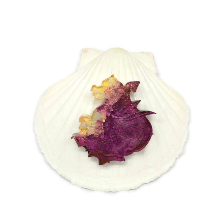 I love making dragons and the colour combination of pink and yellow and the reaction of the alcohol inks when I add them in to the resin creating unusual patterns, which is known as a petri dish effect, makes for a stunning unique item.