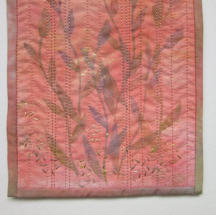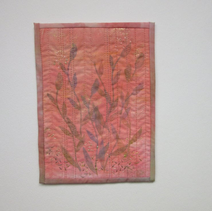 Hand painted fabric has been printed with a leaf pattern and the design has then been layered with fine chiffon fabric and machine quilted. A few scattered hand embroidery stitches give added texture. It is backed with lemon cotton fabric and has a small plastic ring for hanging.